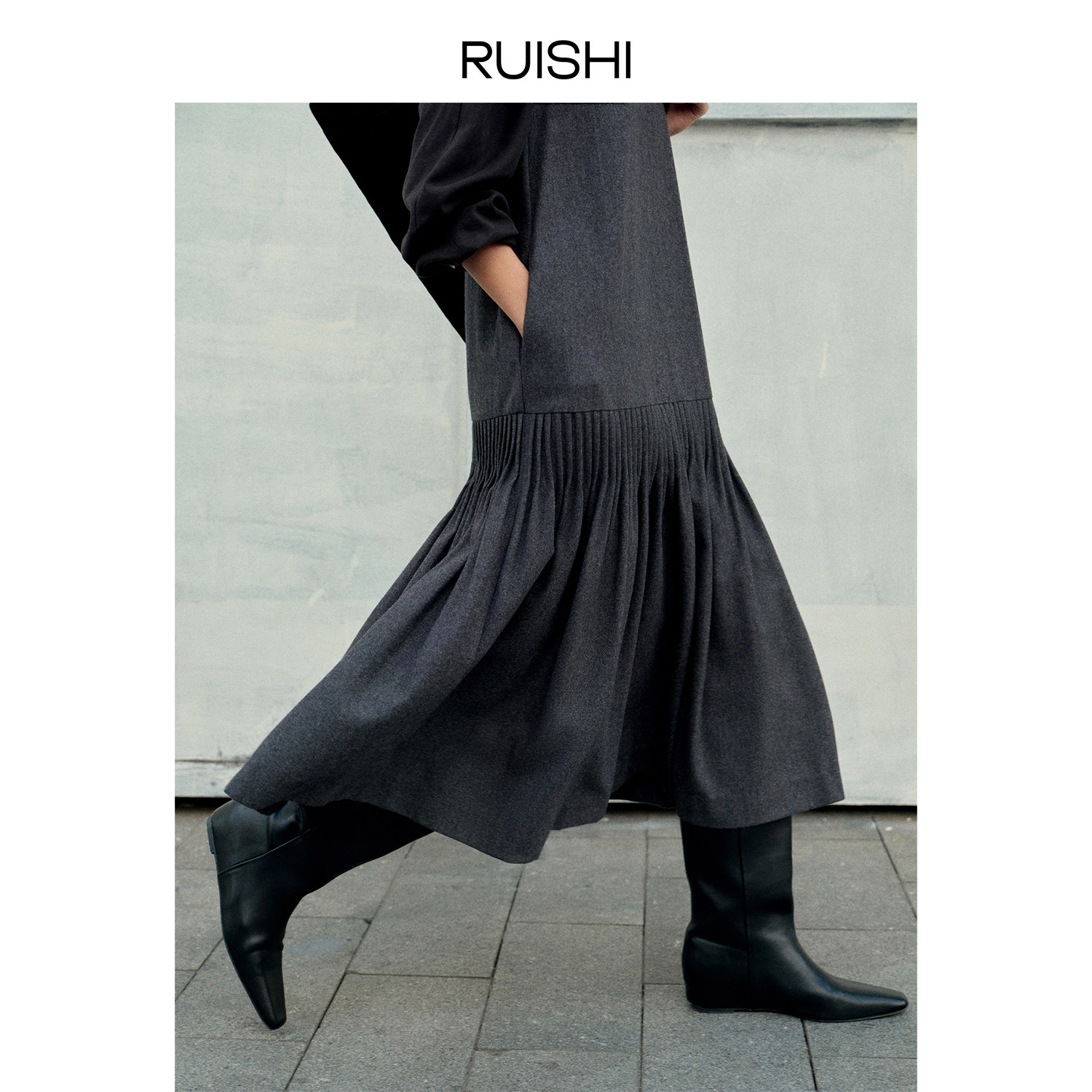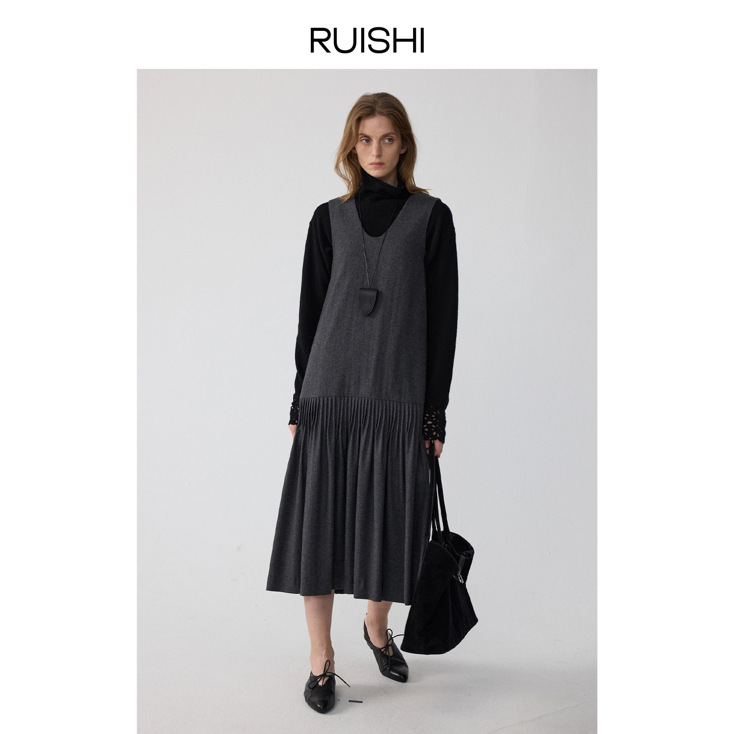 RUISHI芮时 手工塔克褶羊毛混色V领无袖背心裙A字显瘦连衣裙女冬