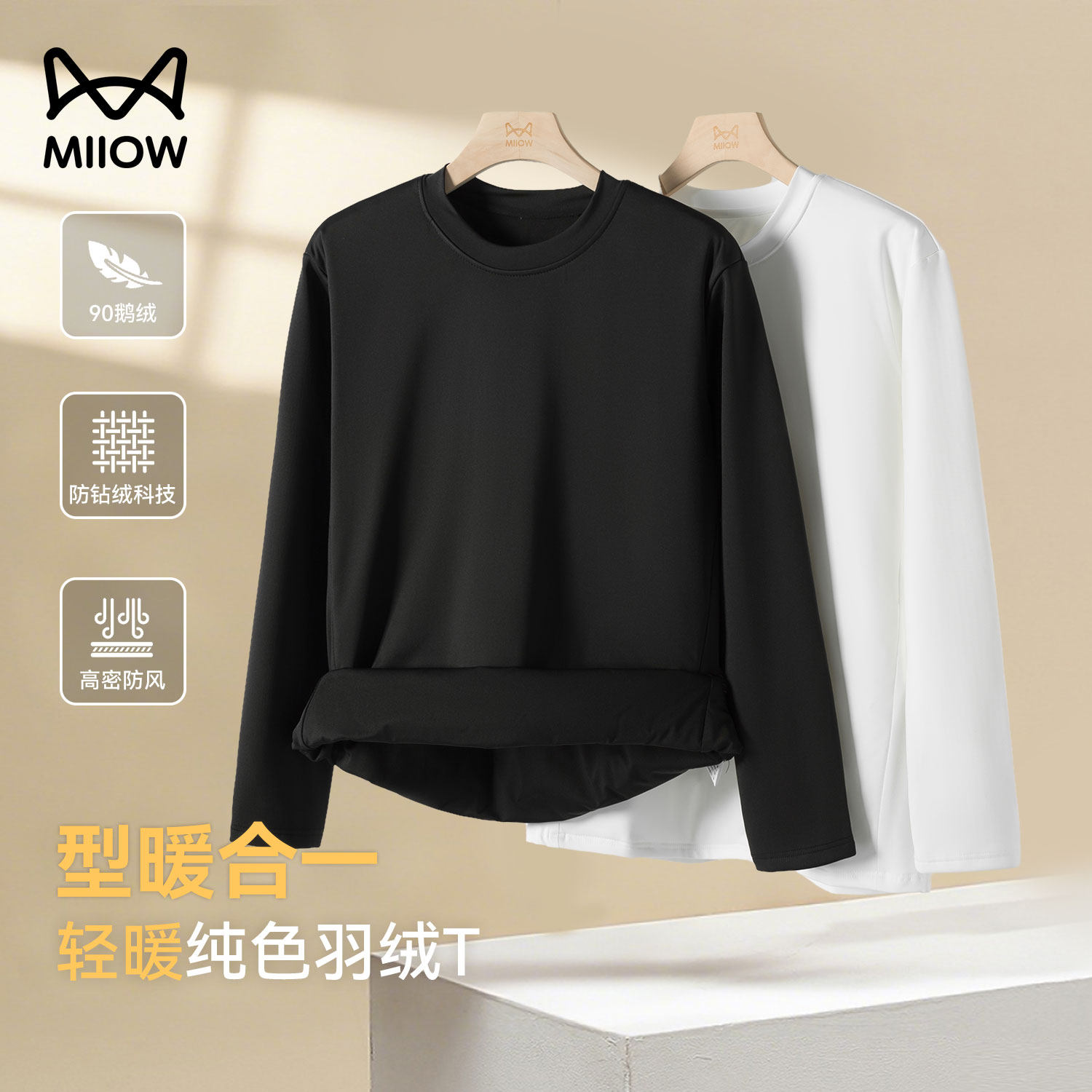 猫人轻盈保暖90鹅绒羽绒卫衣男秋冬季加绒圆领T恤男女情侣打底衫