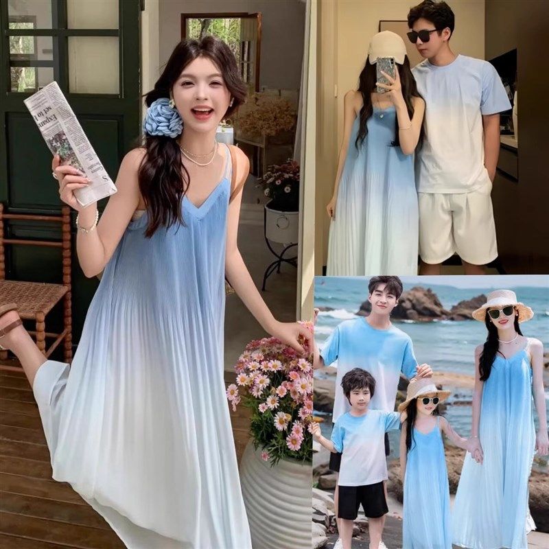 三亚沙滩亲子装一家三口渐变T恤2025新款夏天母女装吊带连衣裙子