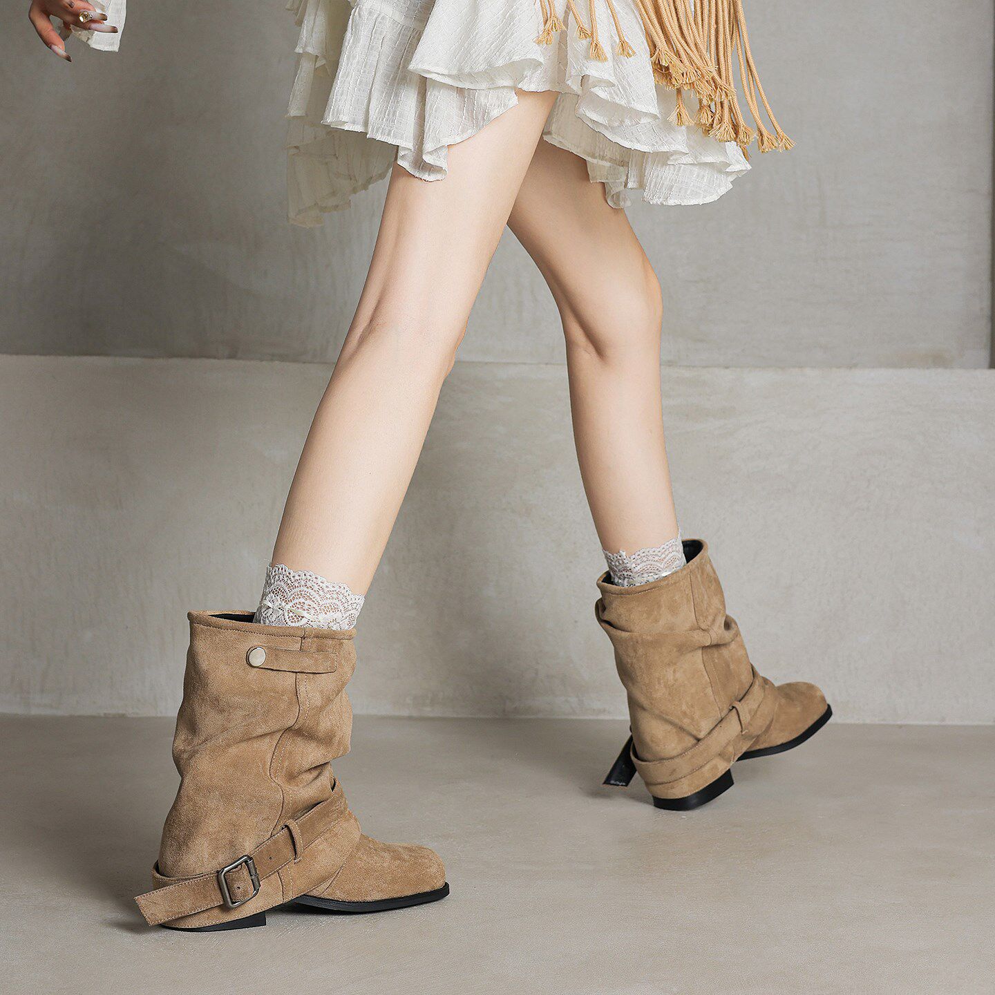 甜辣玩家靴子2025秋新款圆头粗跟皮带扣短筒堆堆靴女炸街马丁短靴