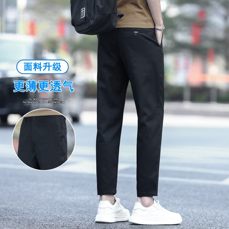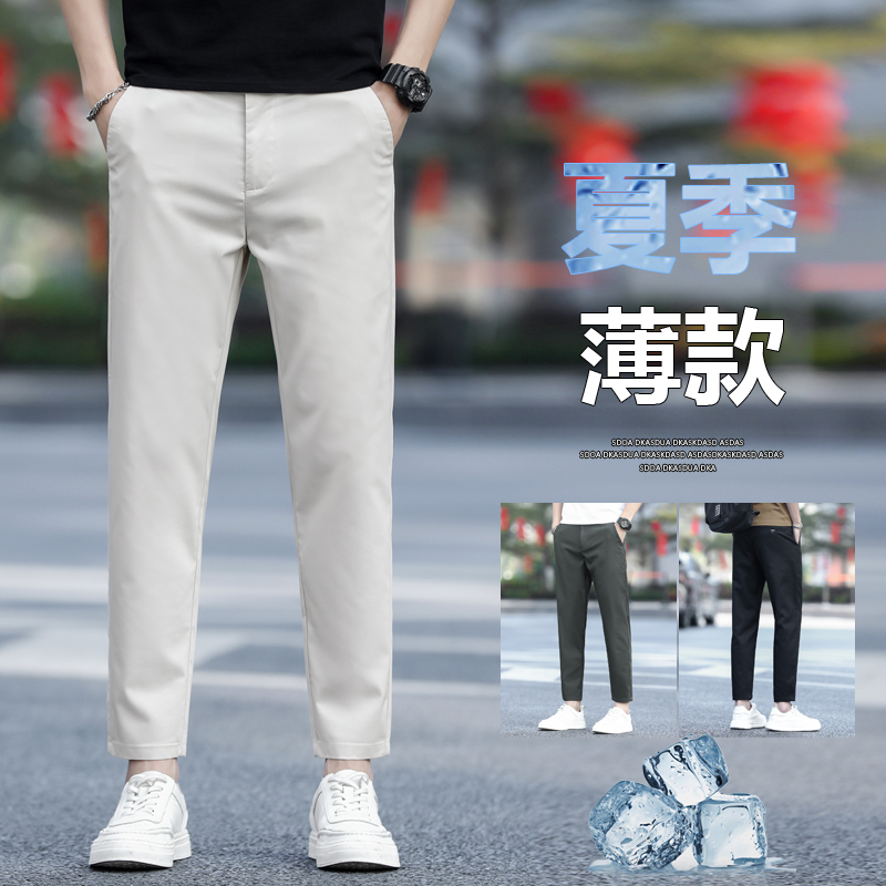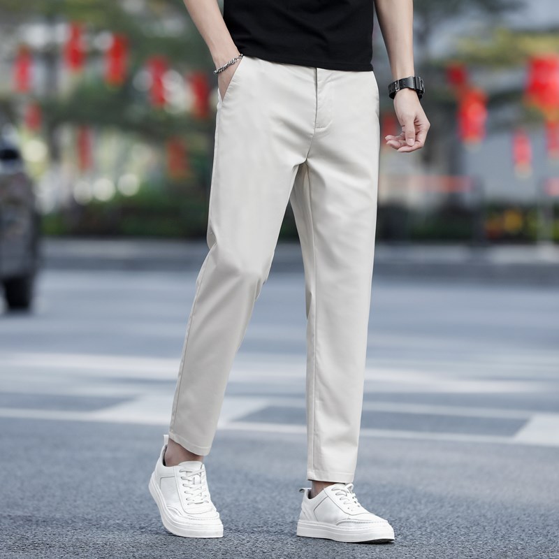 男生休闲裤锥形九分裤修身小直筒米白色裤子男9分时尚男裤夏季薄