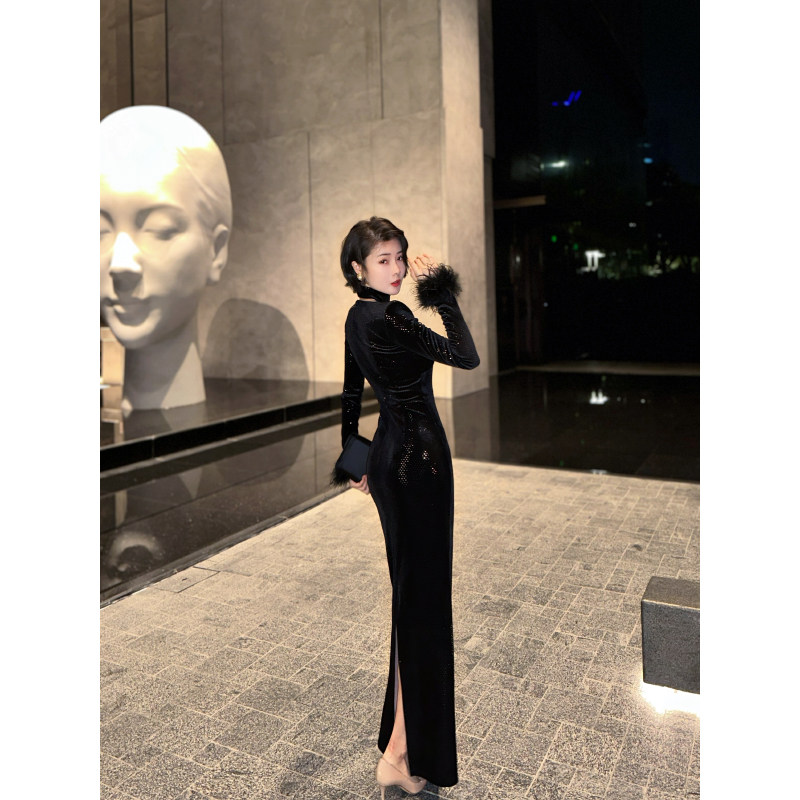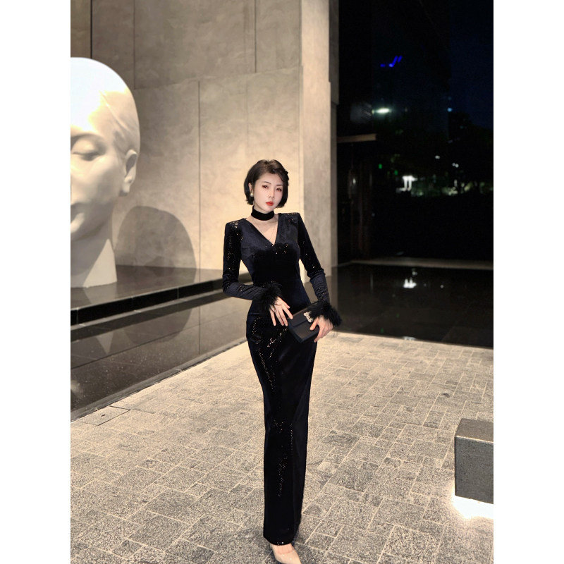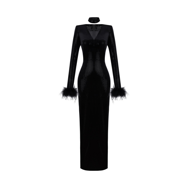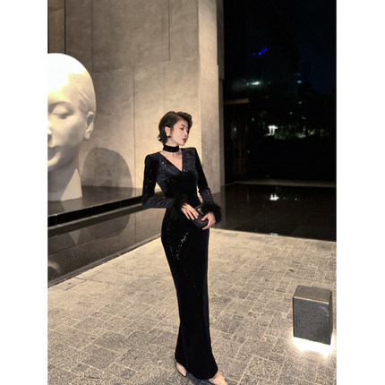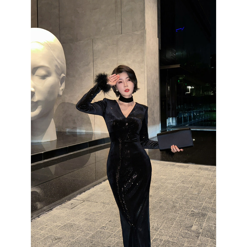 XULU原创进口丝绒烫珠片包臀裙黑色修身性感长袖口羽毛V领连衣裙