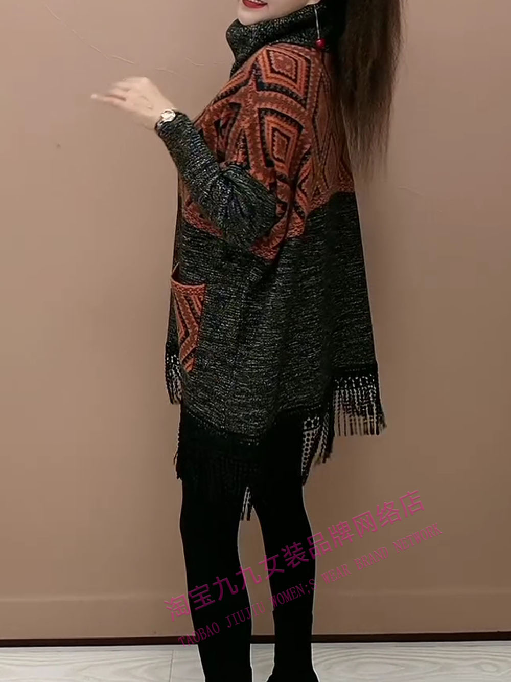 洋气妈妈拼色高领针织裙女秋冬遮肚减龄中长款流苏外套毛衣打底裙