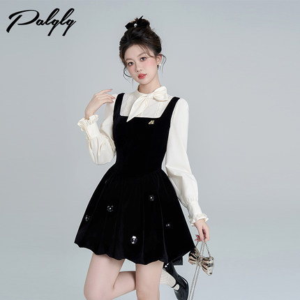miu系甜美黑色背带花苞连衣裙女秋季高级感法式气质甜美显瘦a字裙