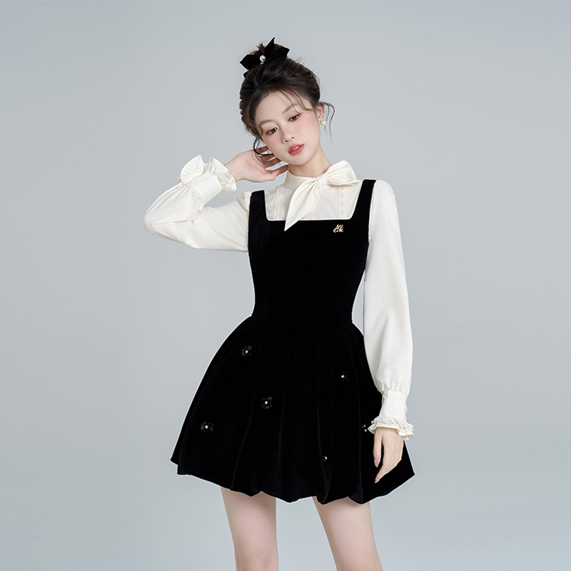 miu系甜美黑色背带花苞连衣裙女