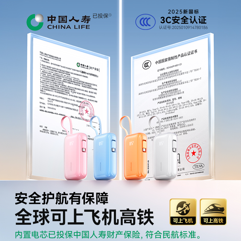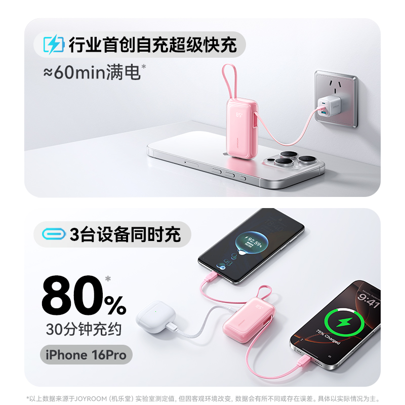 【充电宝3C认证可上飞机】机乐堂伸缩宝2025新款30W快充自带双线小巧迷你国标识可便携带适用苹果华为手机