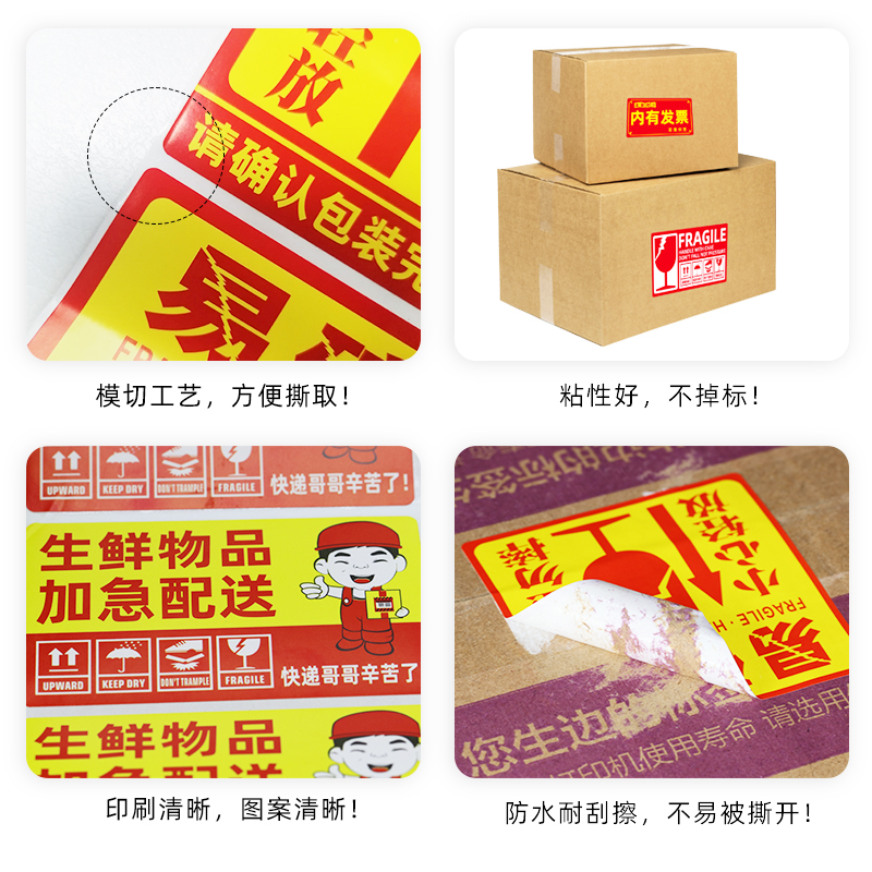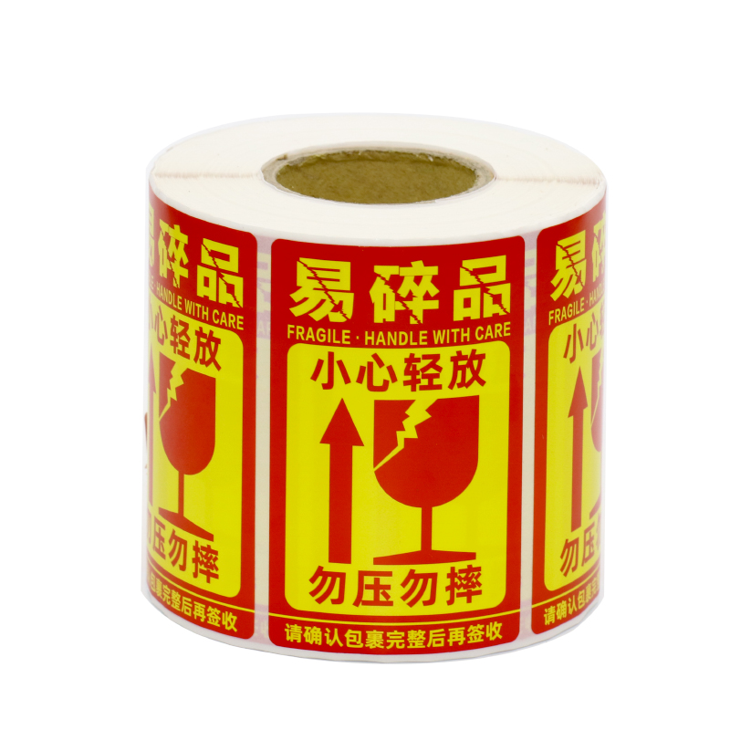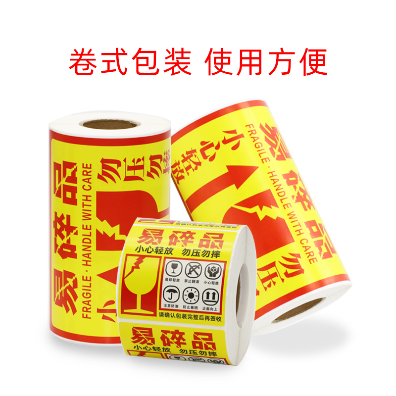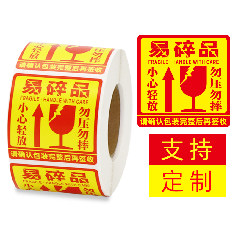 易碎品不干胶标签贴纸警示贴英文包装纸50*50小心轻拿轻放快递物流外箱贴100*100大号勿压一次性贴标签纸定制