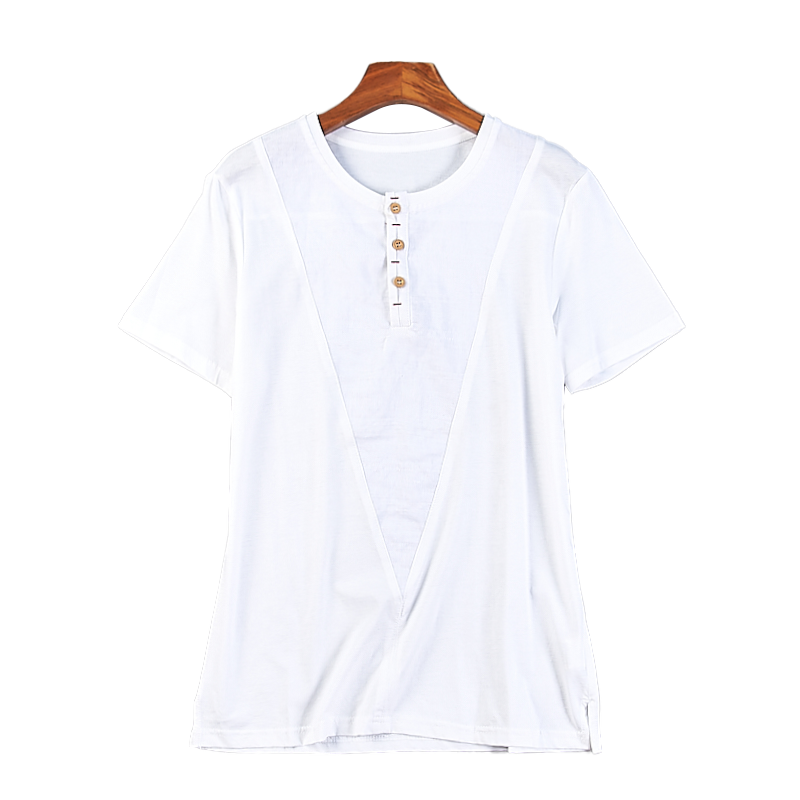 1121中式复古文艺宽松T恤男女79570纽扣圆领纯色设计感短袖上衣夏