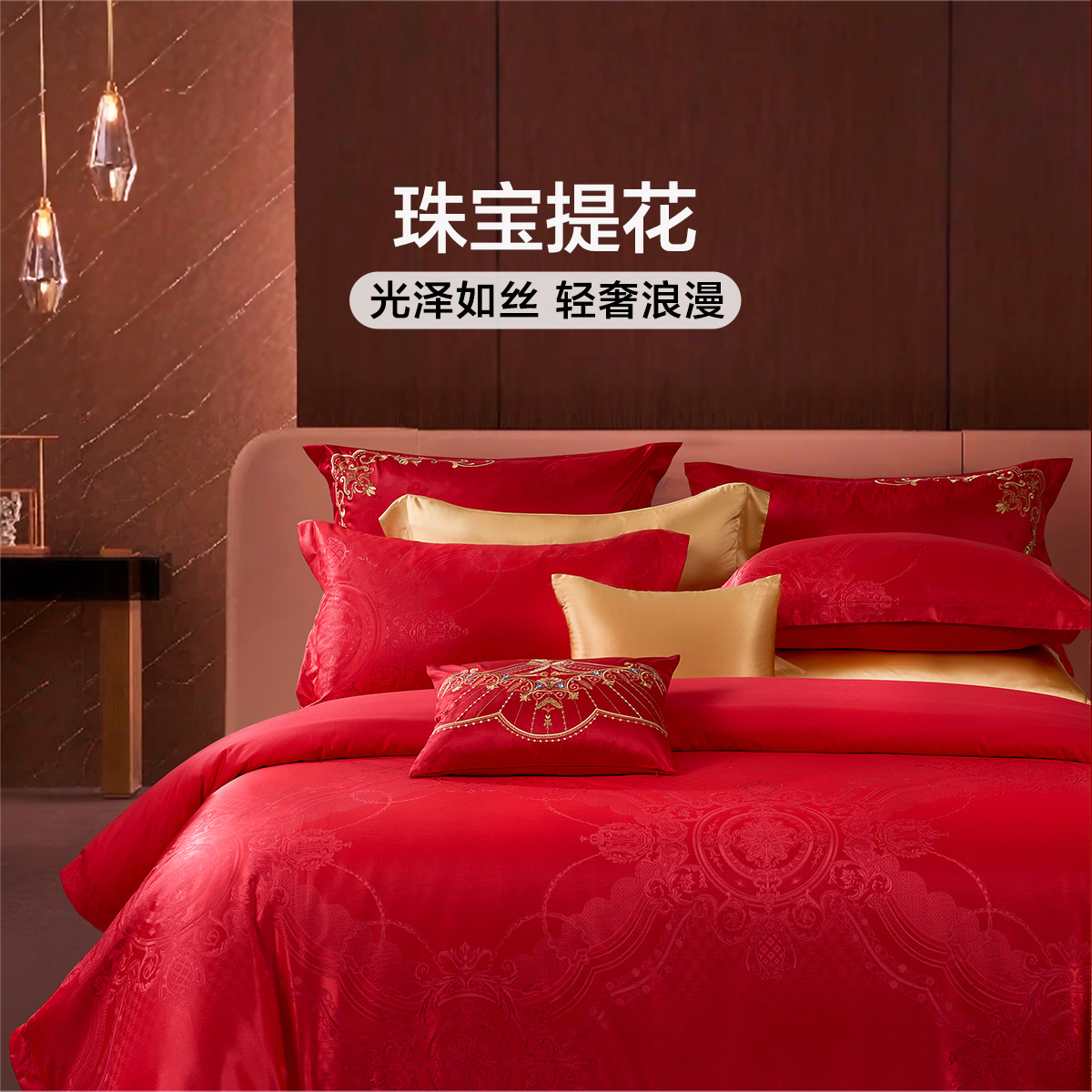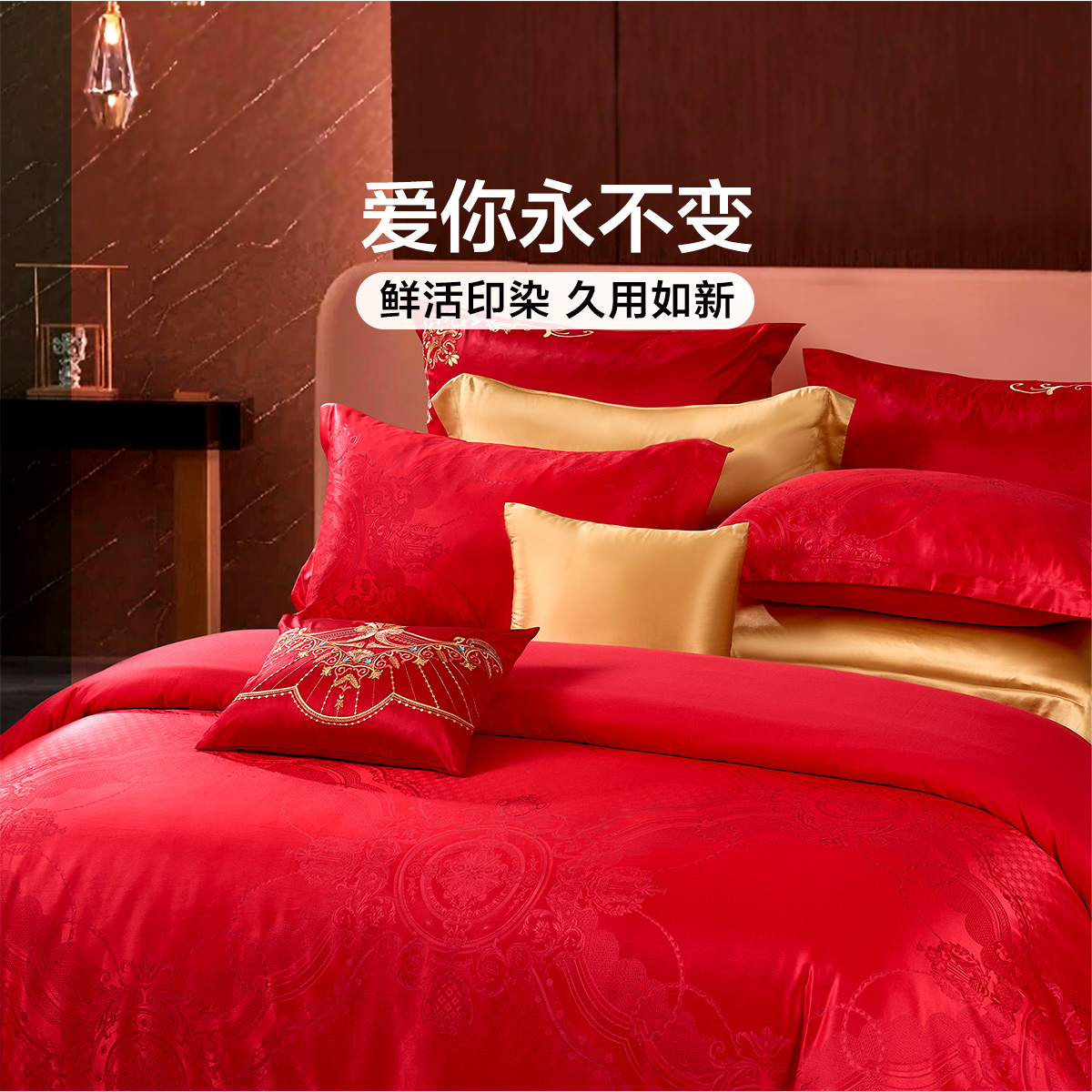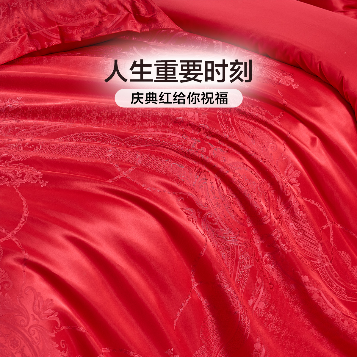 富安娜结婚四件套红色床上用品婚庆床单喜庆提花套件纯棉新婚被套