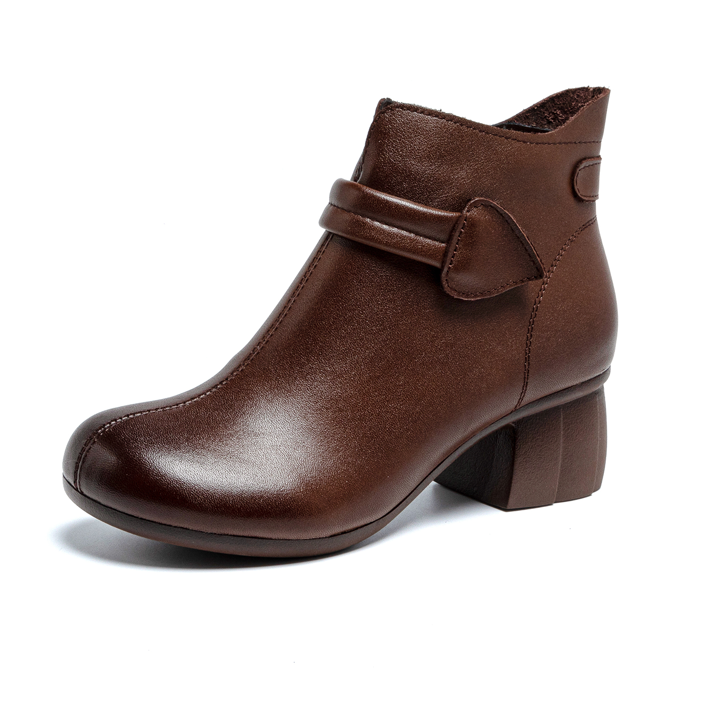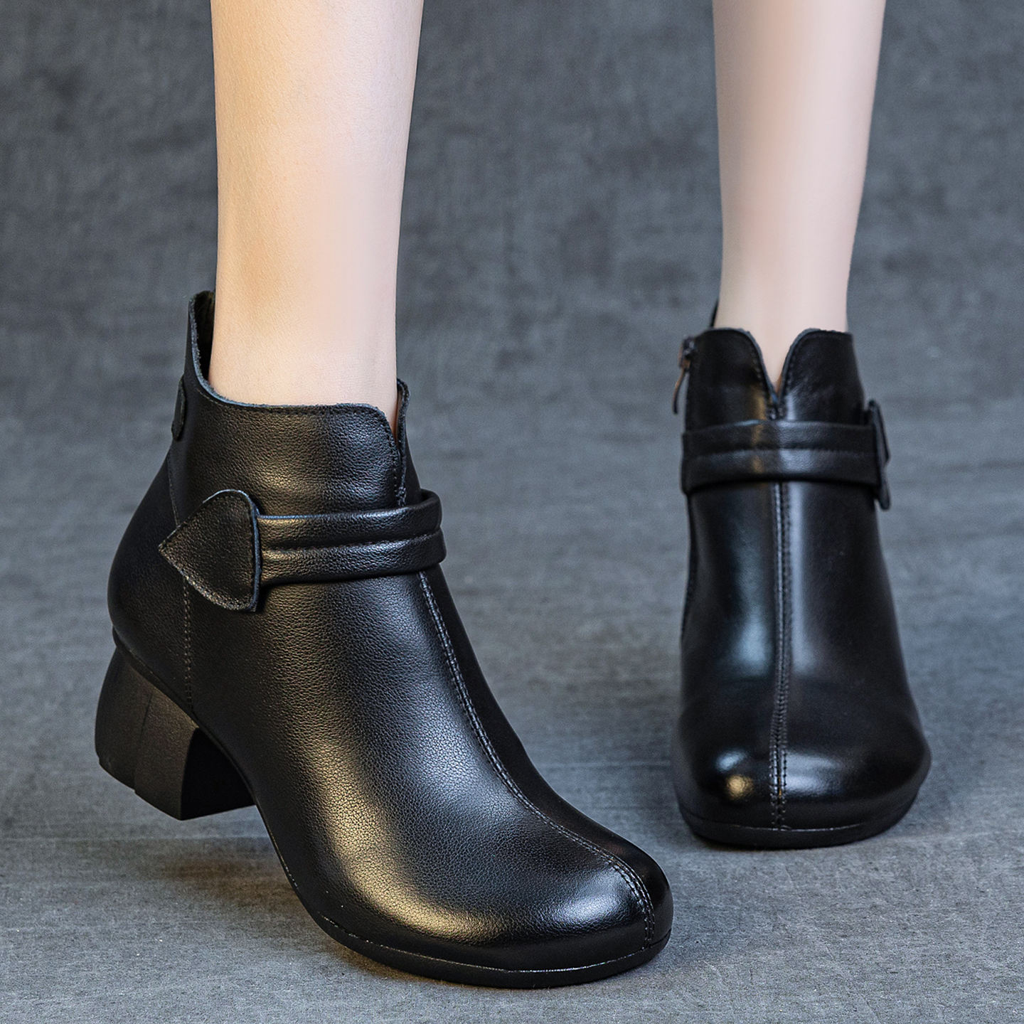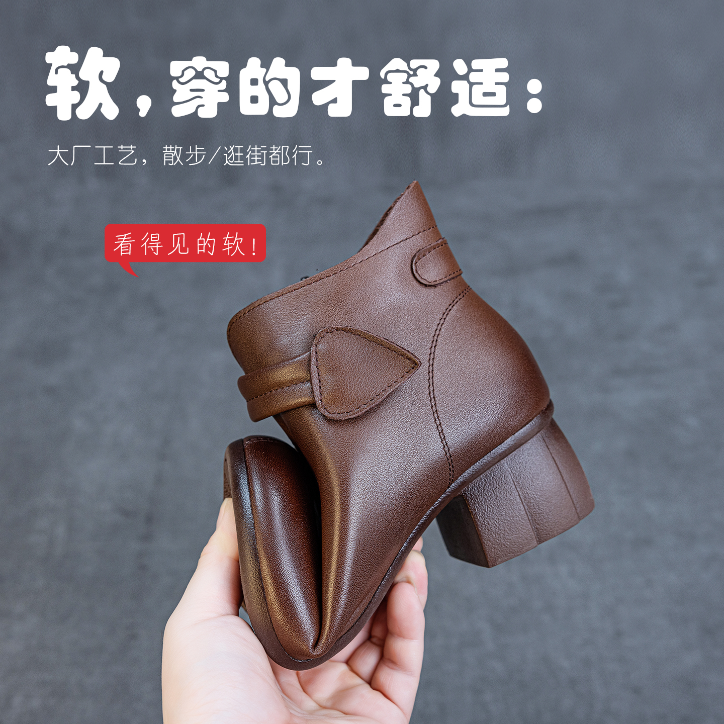 靴子女2025秋冬季新款中粗跟软底头层牛皮女靴加绒棉靴复古女短靴