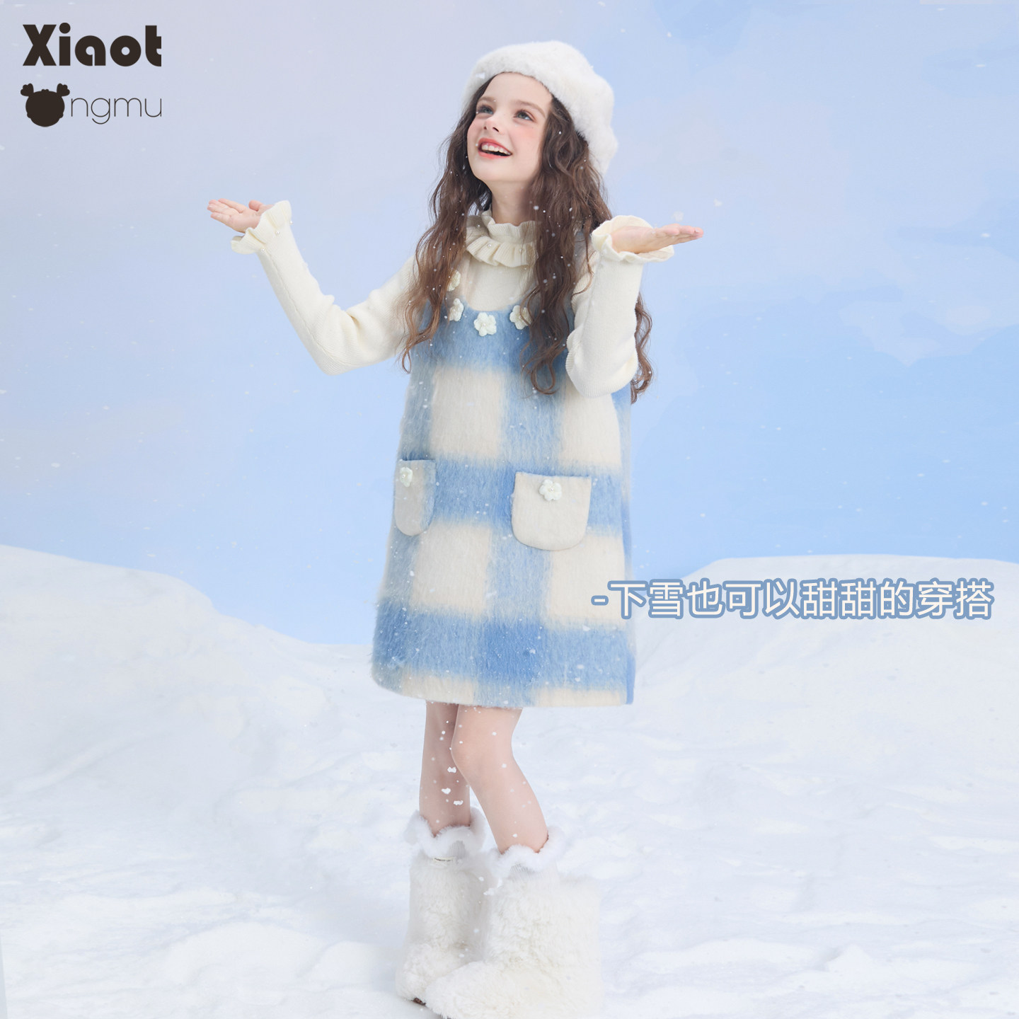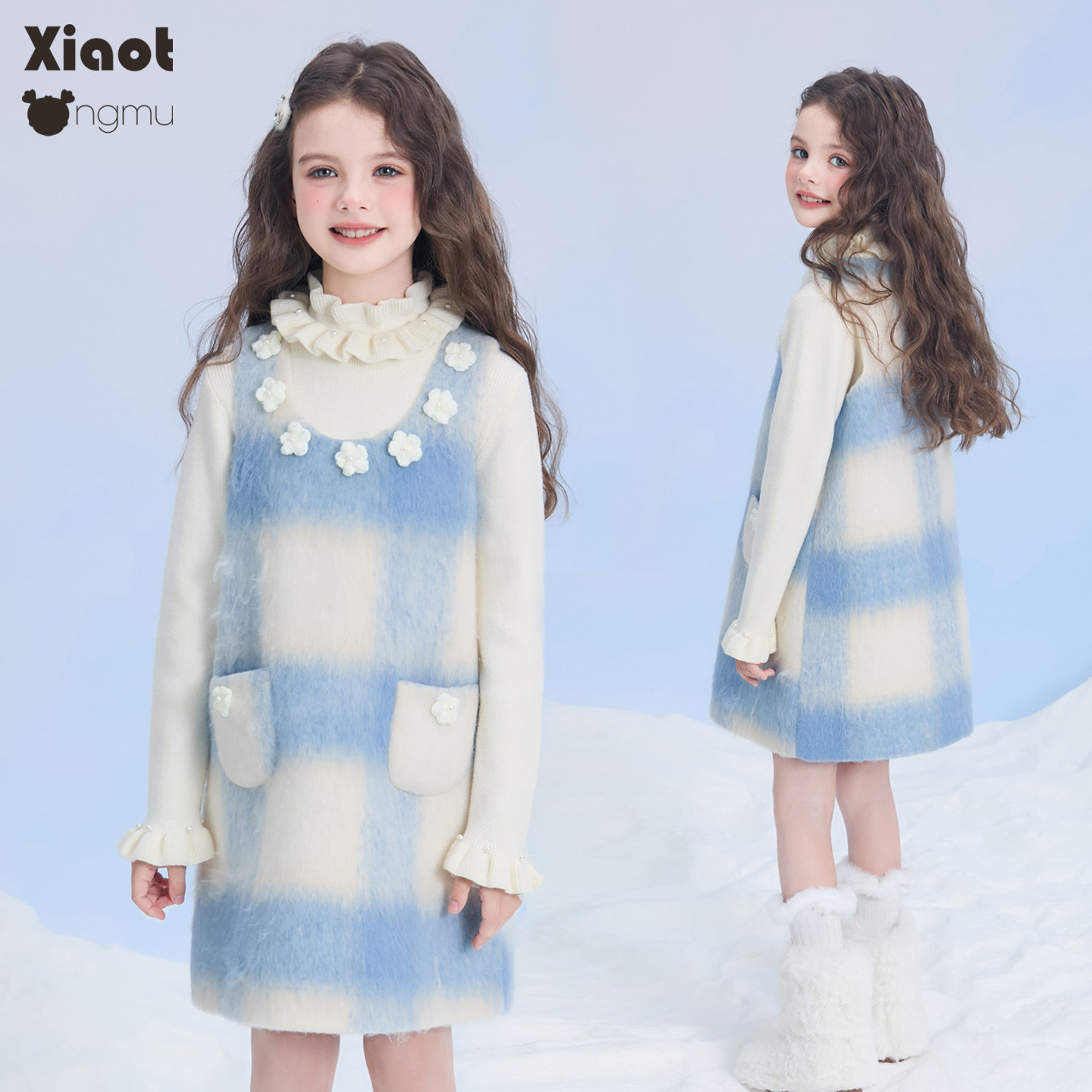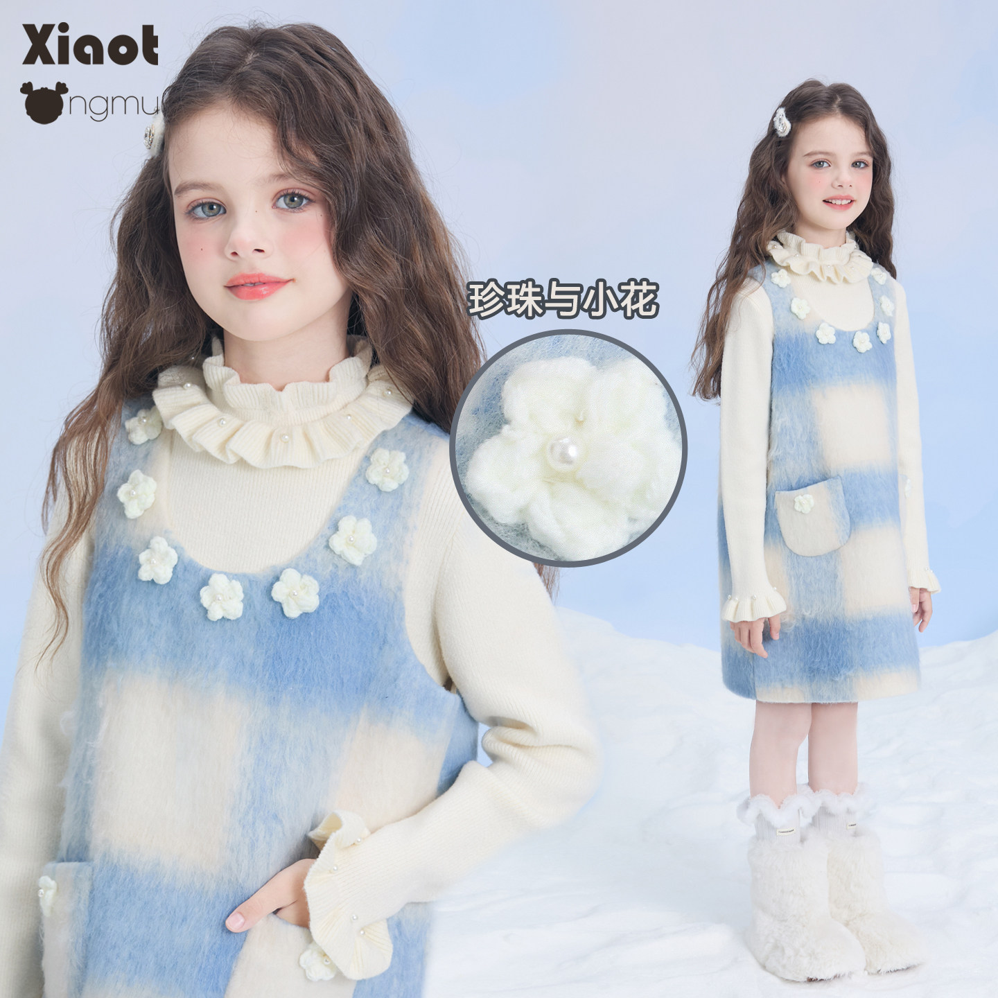 小童木 甜美蓝白格女童连衣裙冬装新款立体花朵中大童毛呢背心裙