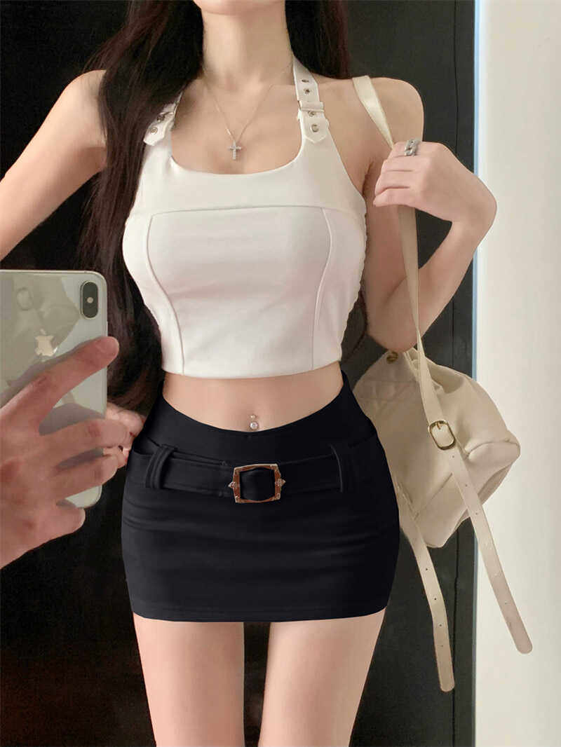 白色V腰半身裙女春秋新款百搭显瘦修身包臀裙防走光腰带短裙子黑