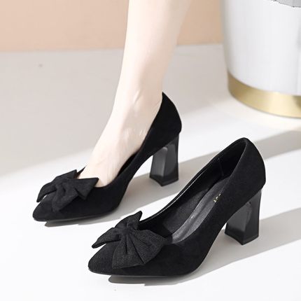 蝴蝶结洋气高跟鞋新款尖头绒面浅口粗跟单鞋舒适黑色职业工作女鞋