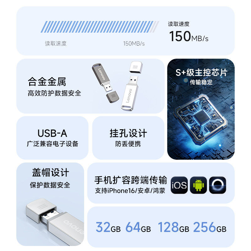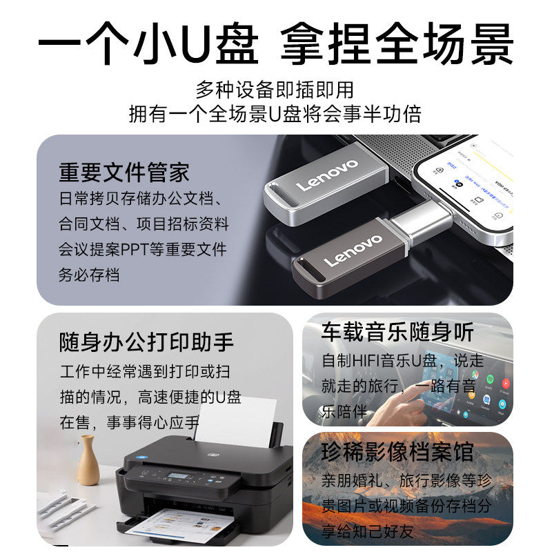 联想U盘高速电脑优盘大容量办公USB3.2金属定制正品官方旗舰店64g