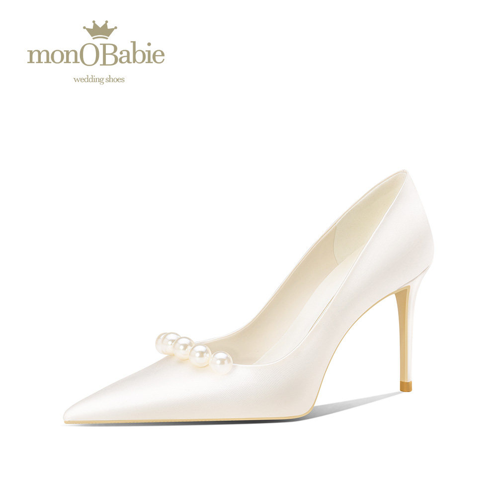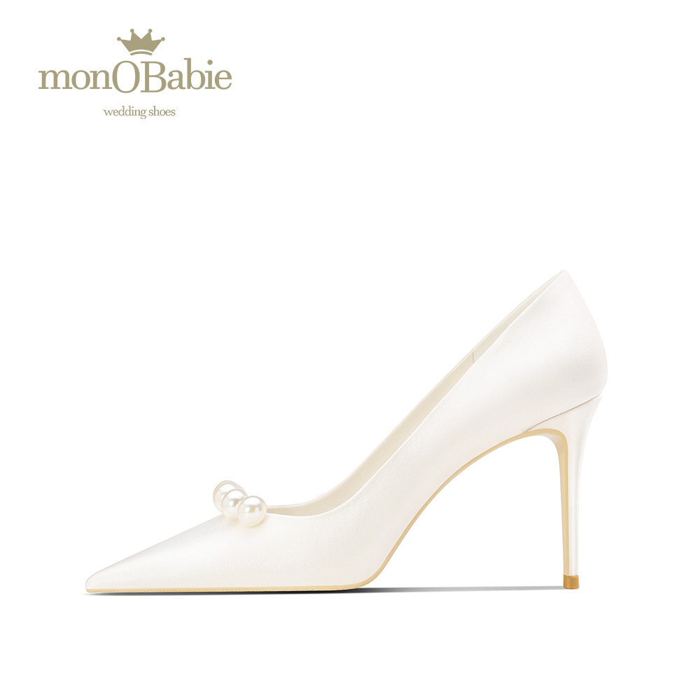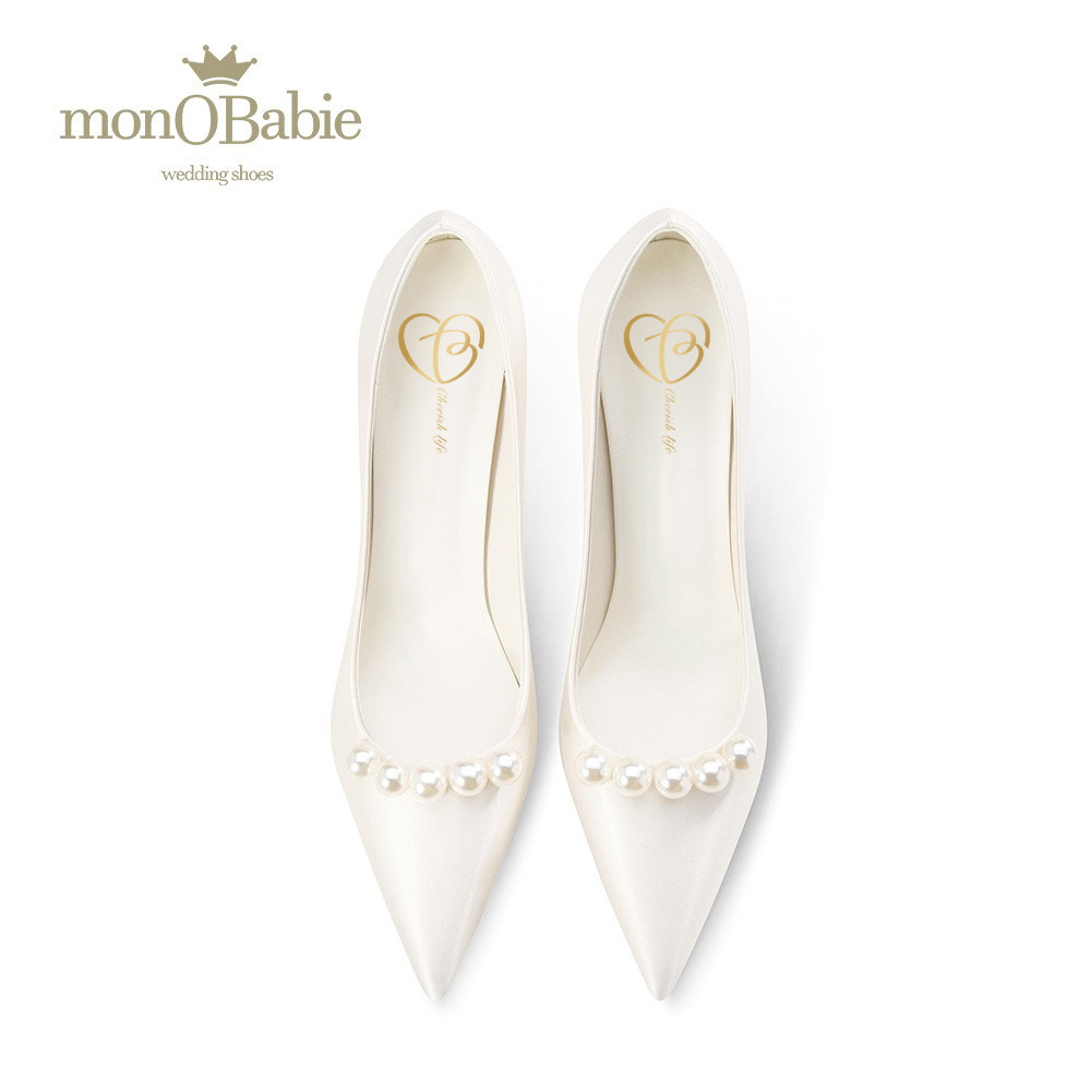 monobabie婚宴鞋 白色法式婚鞋新娘鞋婚纱礼服夏季珍珠高跟伴娘鞋