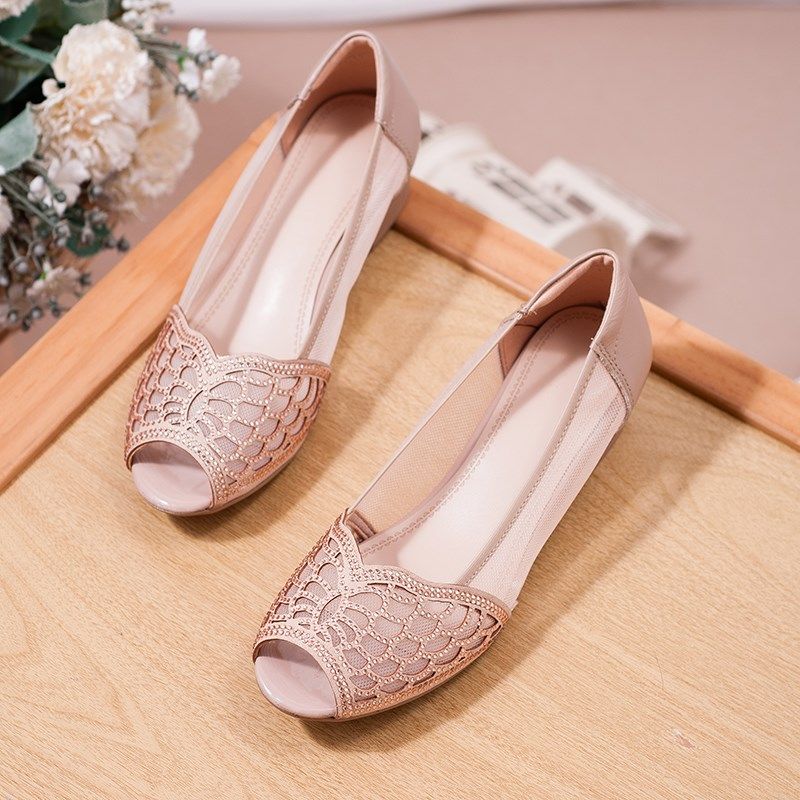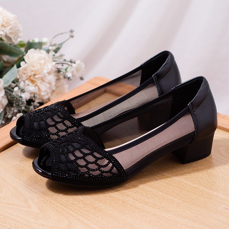 真皮舒适女鞋2024年春季新款网纱透气单鞋粗跟洋气妈妈鞋中跟凉鞋