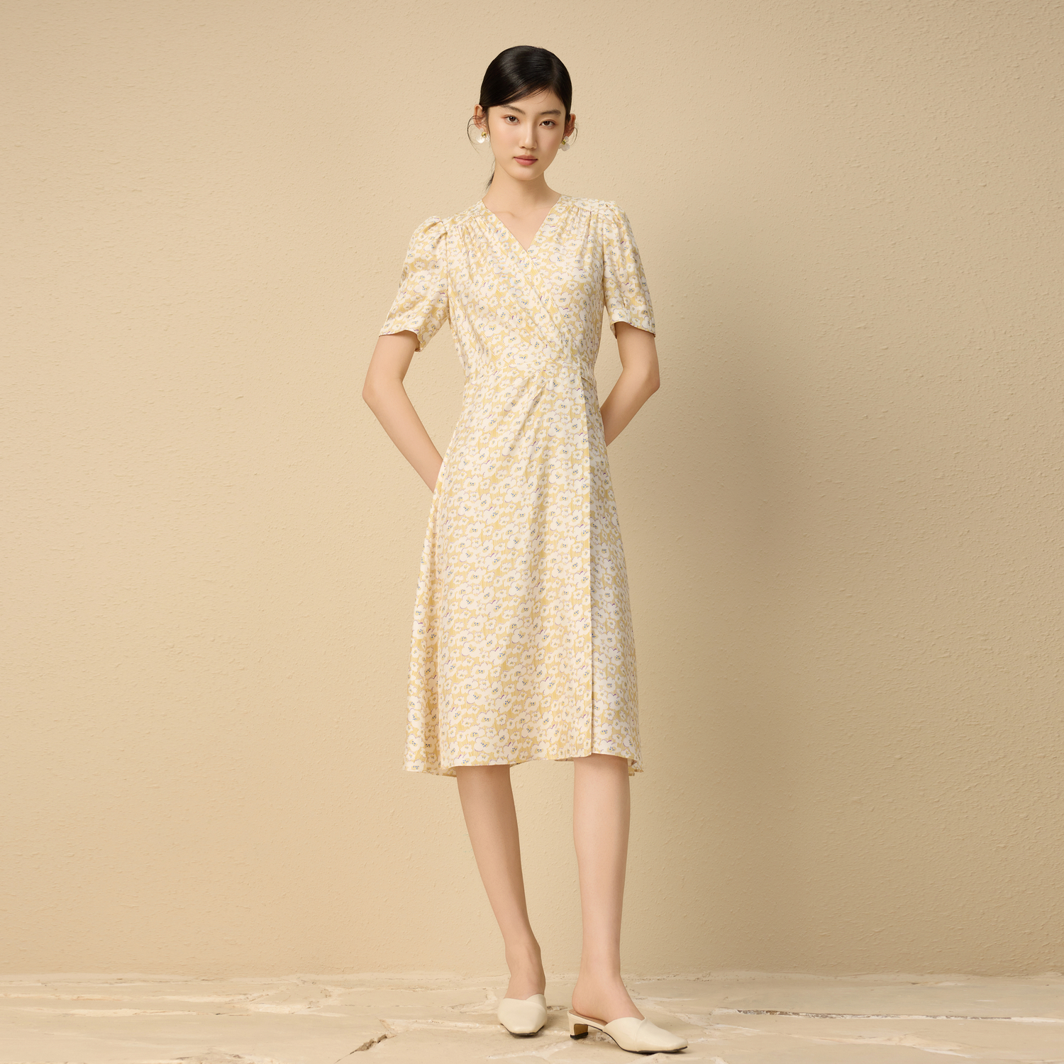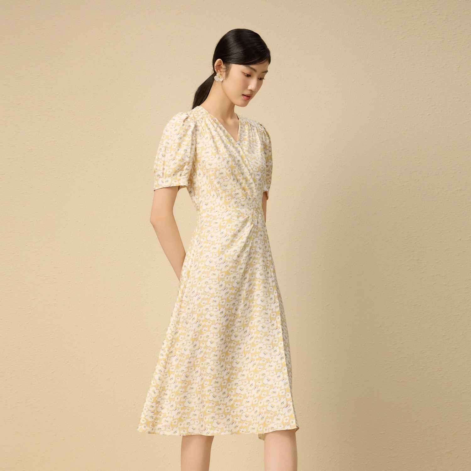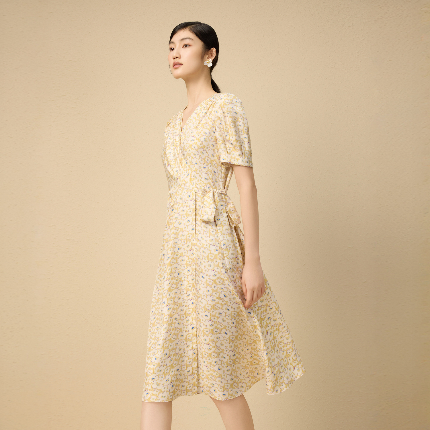 朗姿集团LIME莱茵印花收腰茶歇裙25夏新款V领法式碎花连衣裙