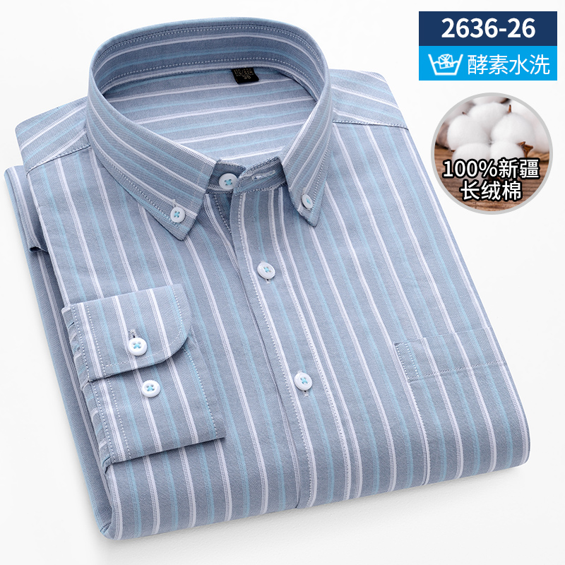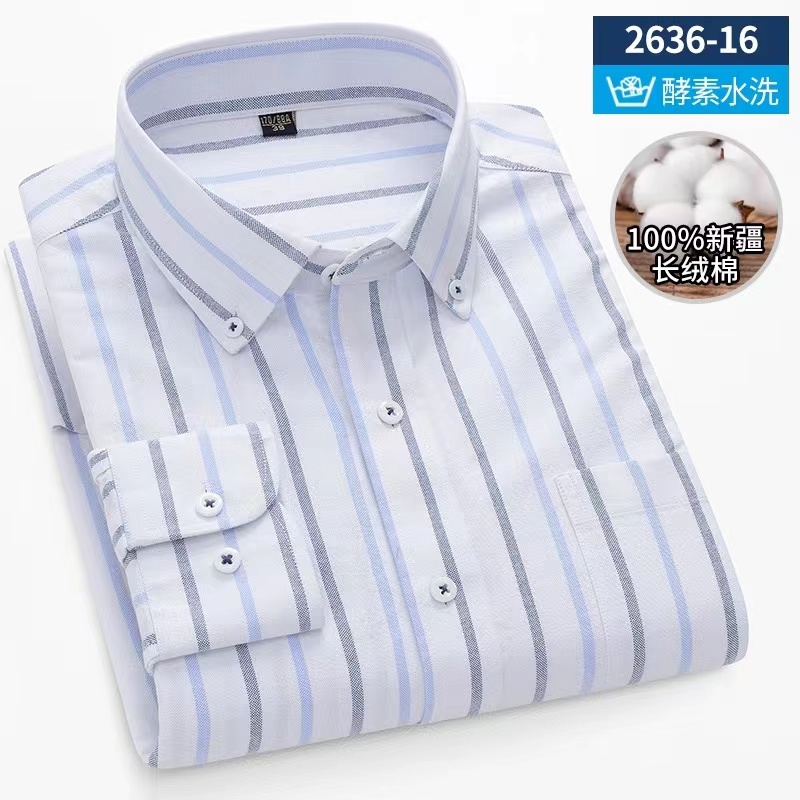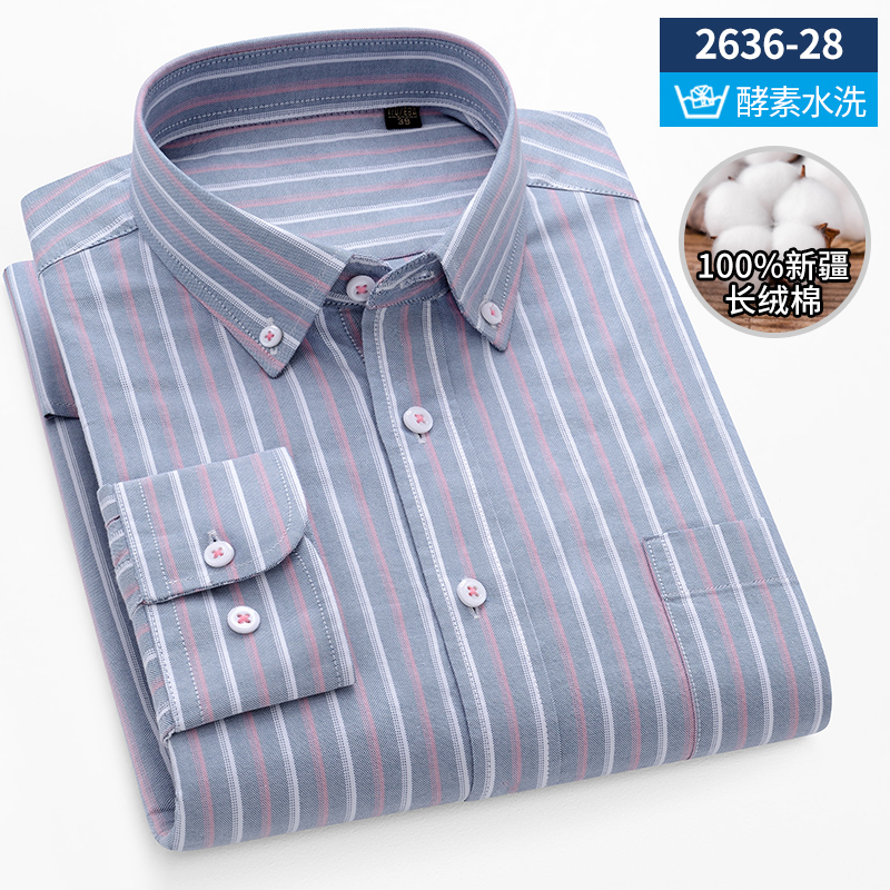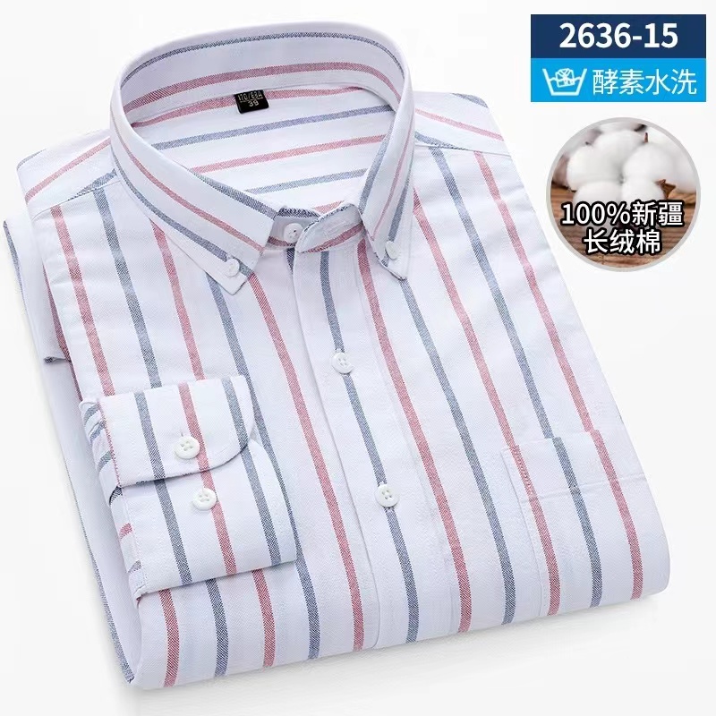 保罗秋季纯棉条纹牛津纺衬衫男士长袖中年爸爸装宽松全棉衬衣大码