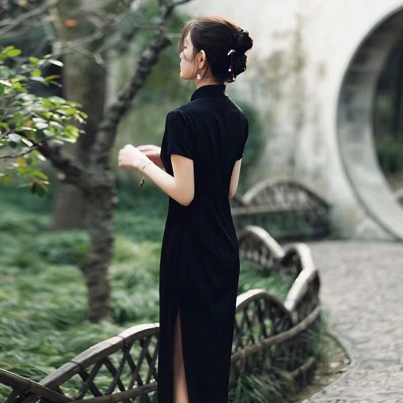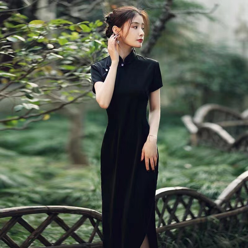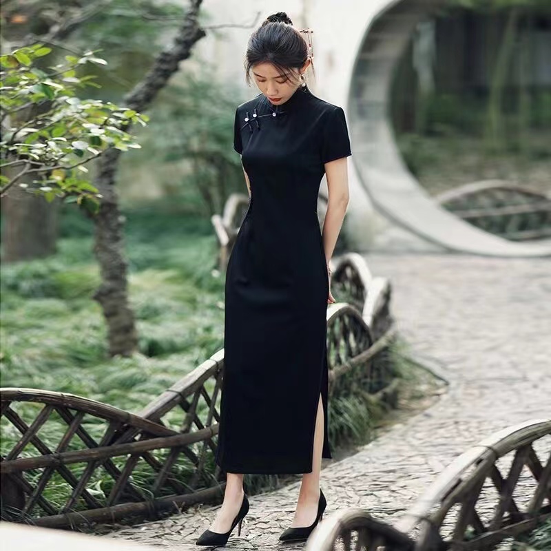 长旗袍改良版2024新夏黑色少女年轻款气质礼服日常复古连衣裙斜襟