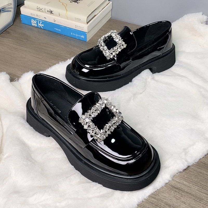 水钻方扣英伦风鞋2025年新款秋冬厚底粗跟乐福鞋单鞋小皮鞋潮