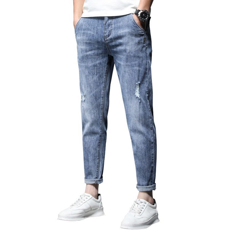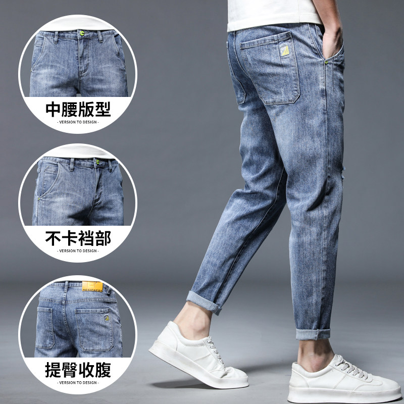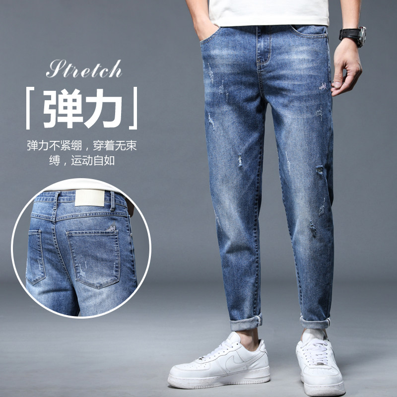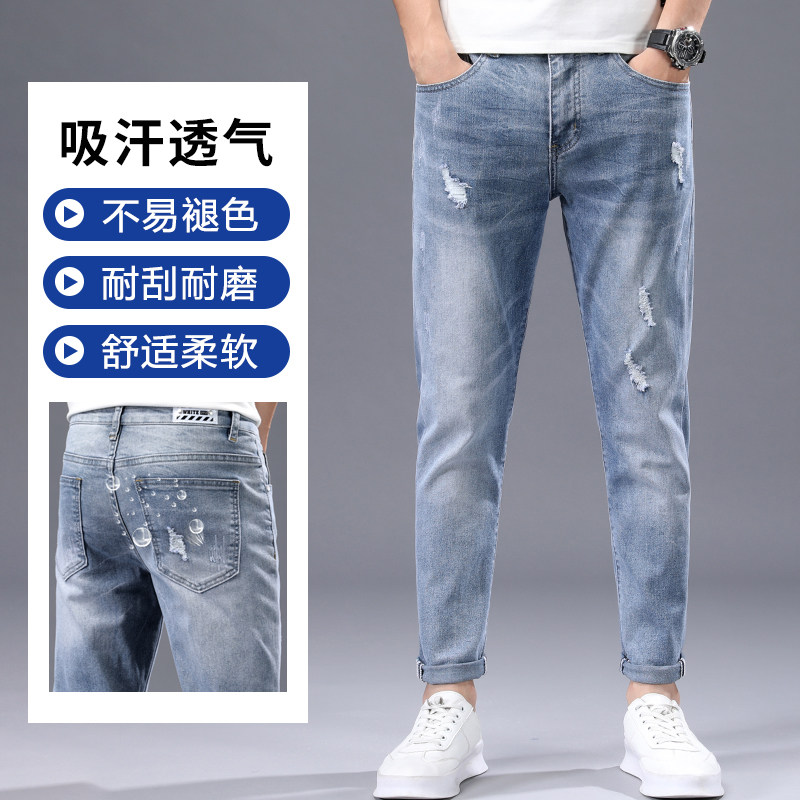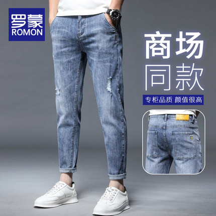 罗蒙牛仔裤男2026新款夏季直筒修身小脚浅色破洞男士休闲9分裤子