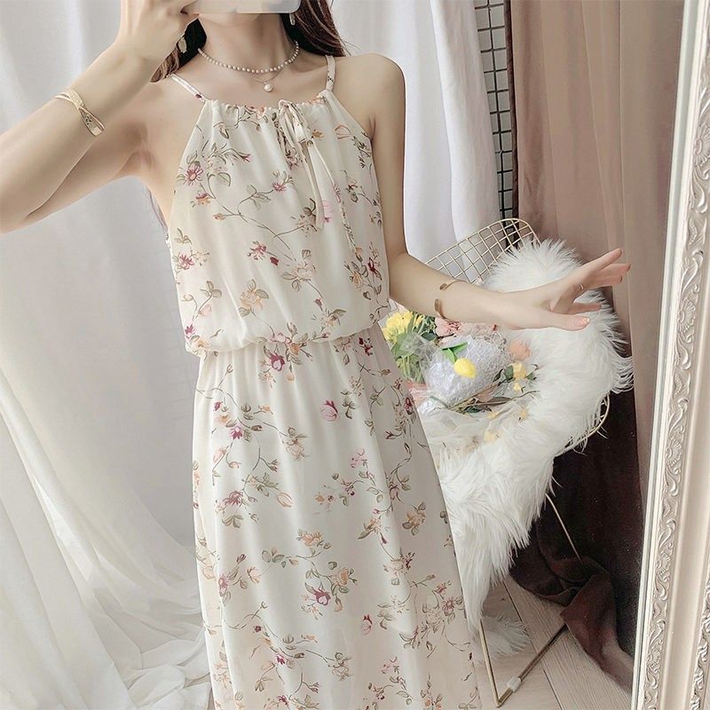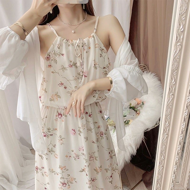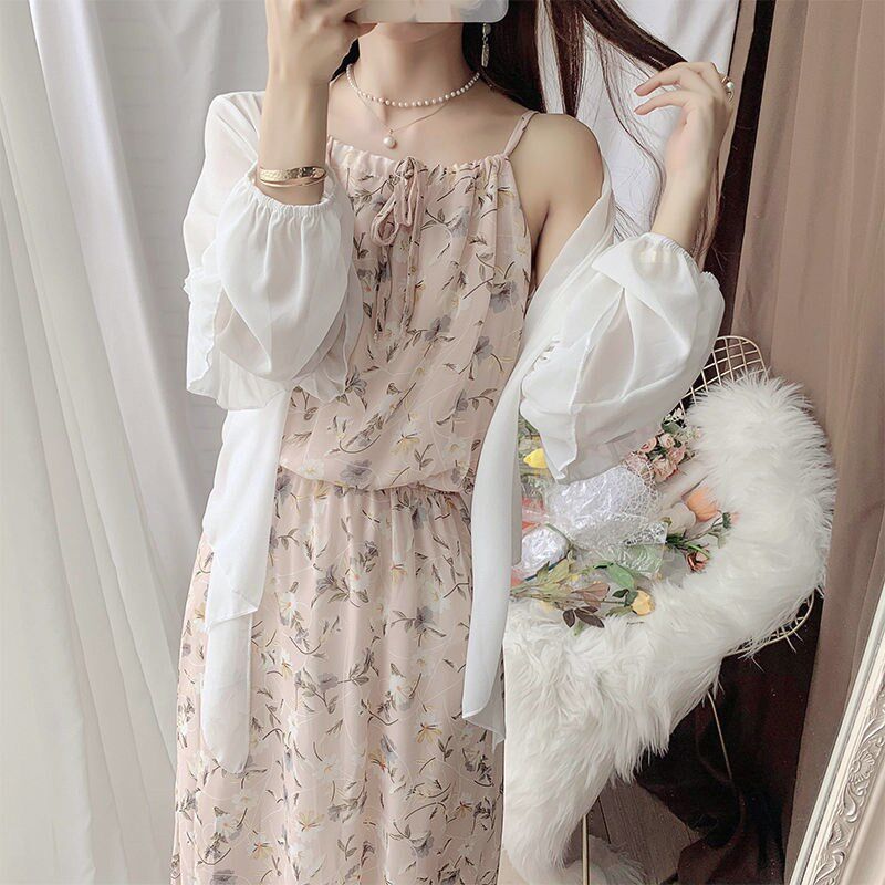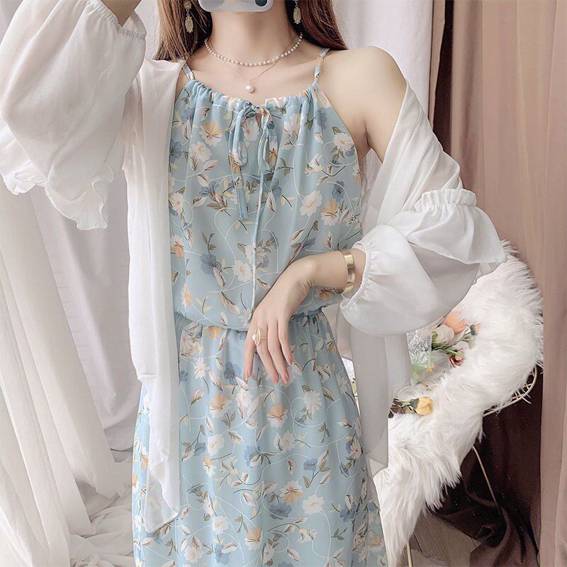 甜美小清新沙滩度假长裙碎花裙吊带连衣裙雪纺衫套装裙两件套子夏