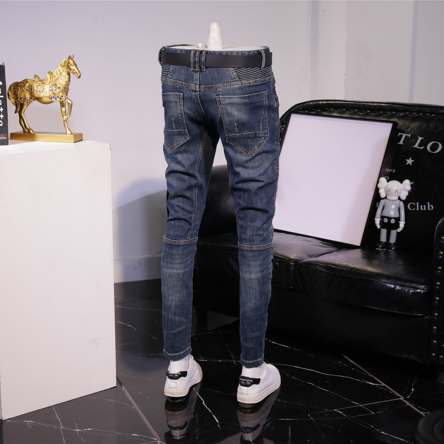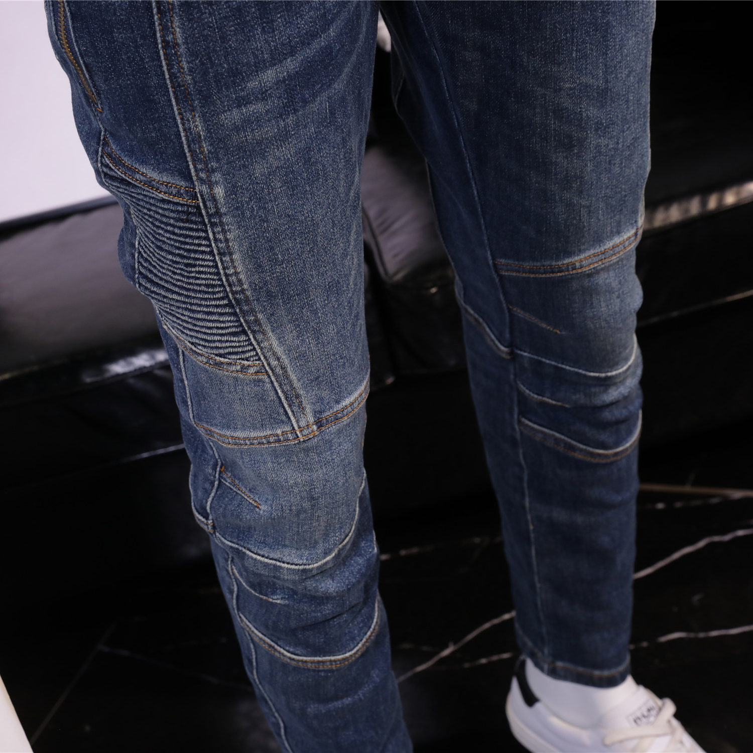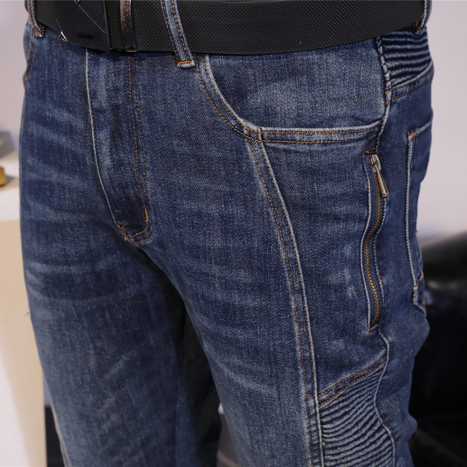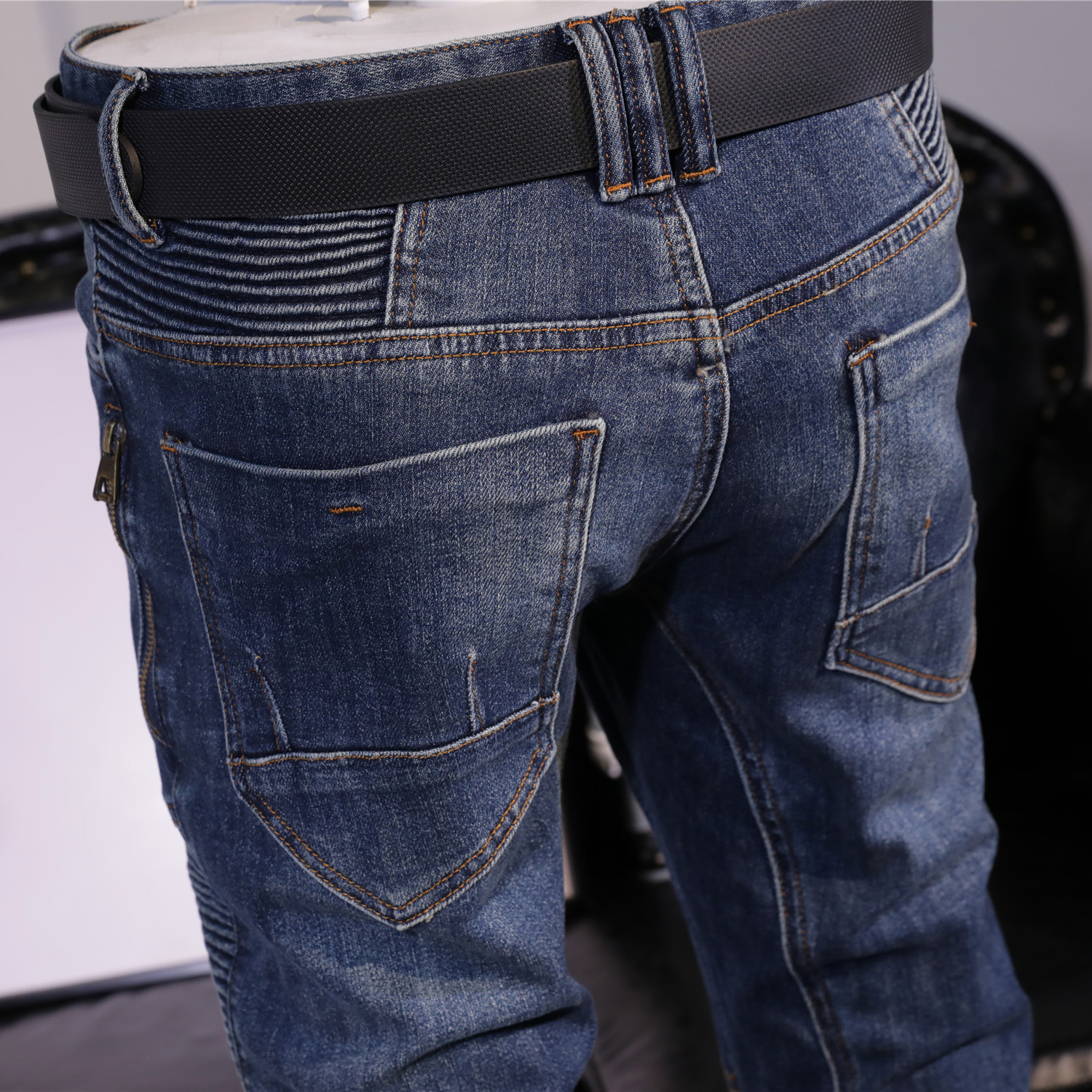 秋冬复古高端牛仔裤男怀旧时尚弹力修身小脚长裤男士拼接小直筒