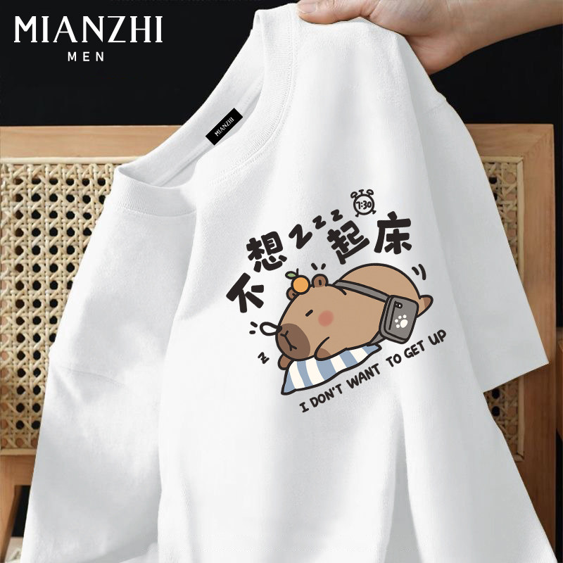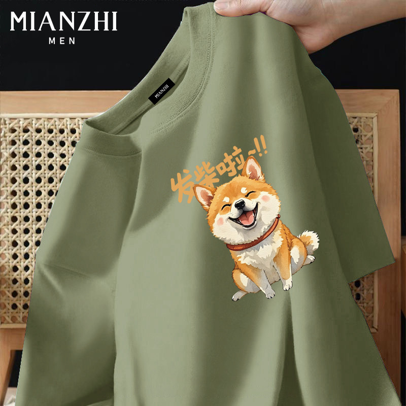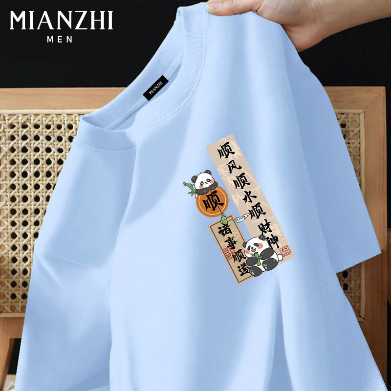 棉致诸事皆顺米色短袖纯棉t恤男士夏季宽松国潮大码熊猫半袖上衣