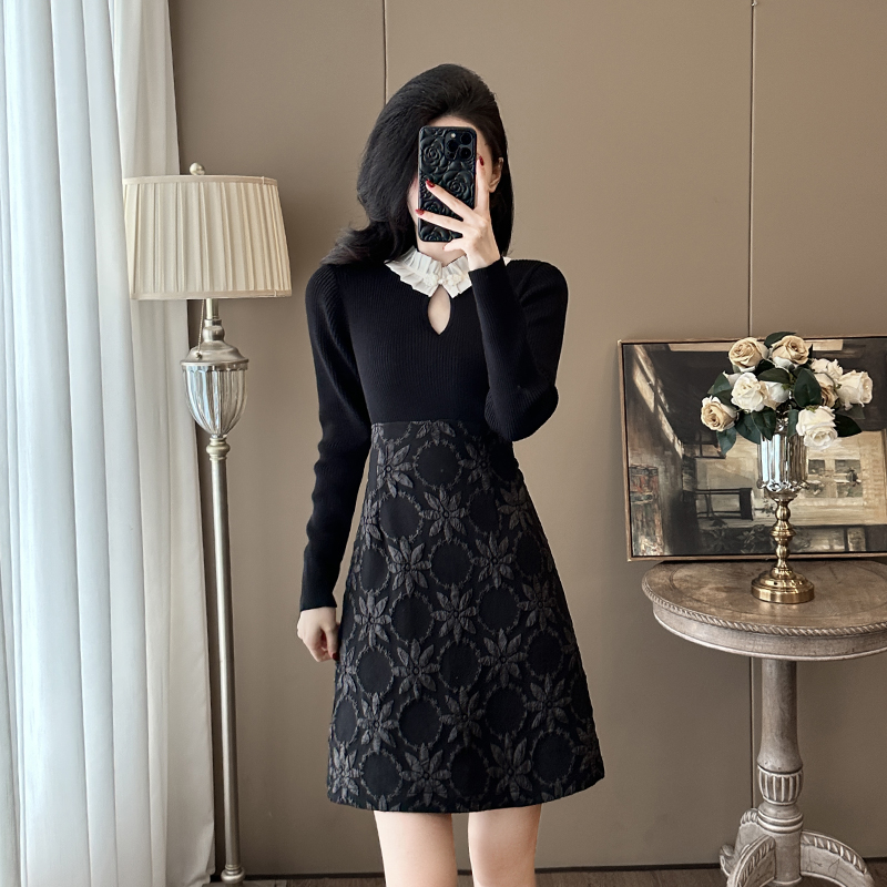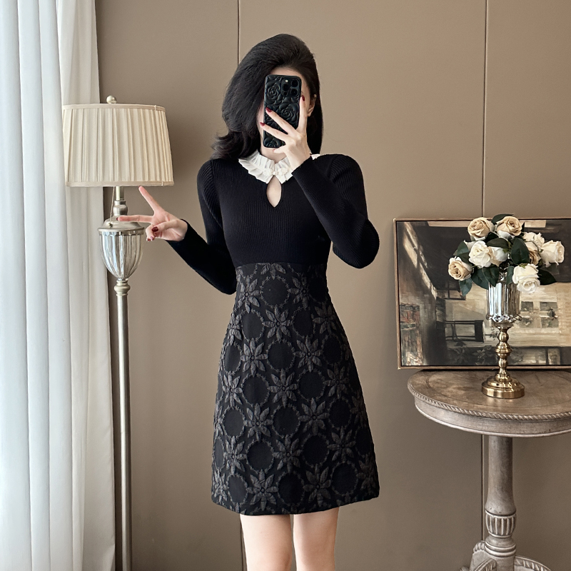 旗袍式针织拼接提花连衣裙女秋季新款高级感新中式国风盘扣黑裙子
