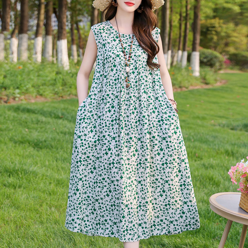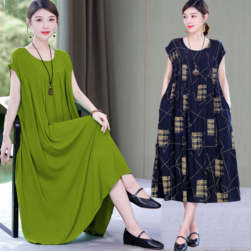 新款妈妈棉绸连衣裙女夏季时尚宽松加肥加大码中老年人造棉长裙子