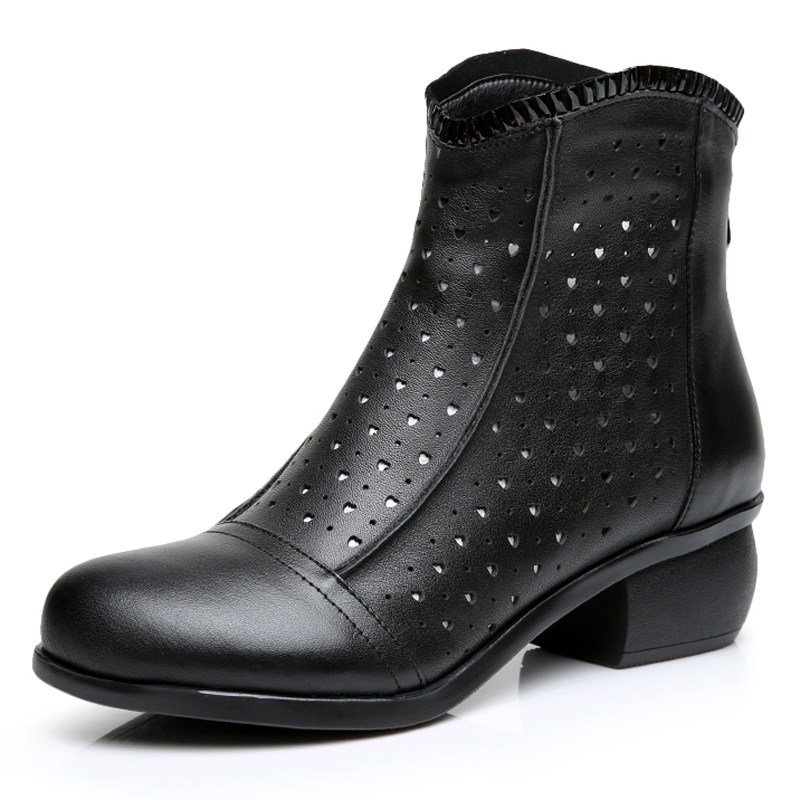 头层牛皮真皮中跟鞋粗跟短靴镂空网靴春秋靴女鞋单靴单鞋短筒女靴