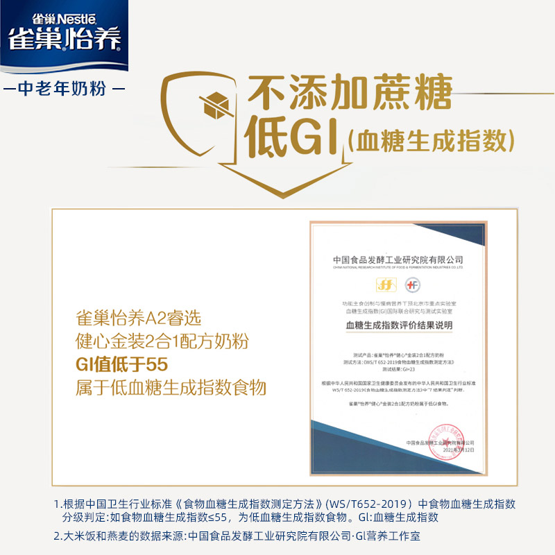 雀巢怡养健心中老年奶粉800g罐装金装2合1无蔗糖高钙牛奶粉送长辈