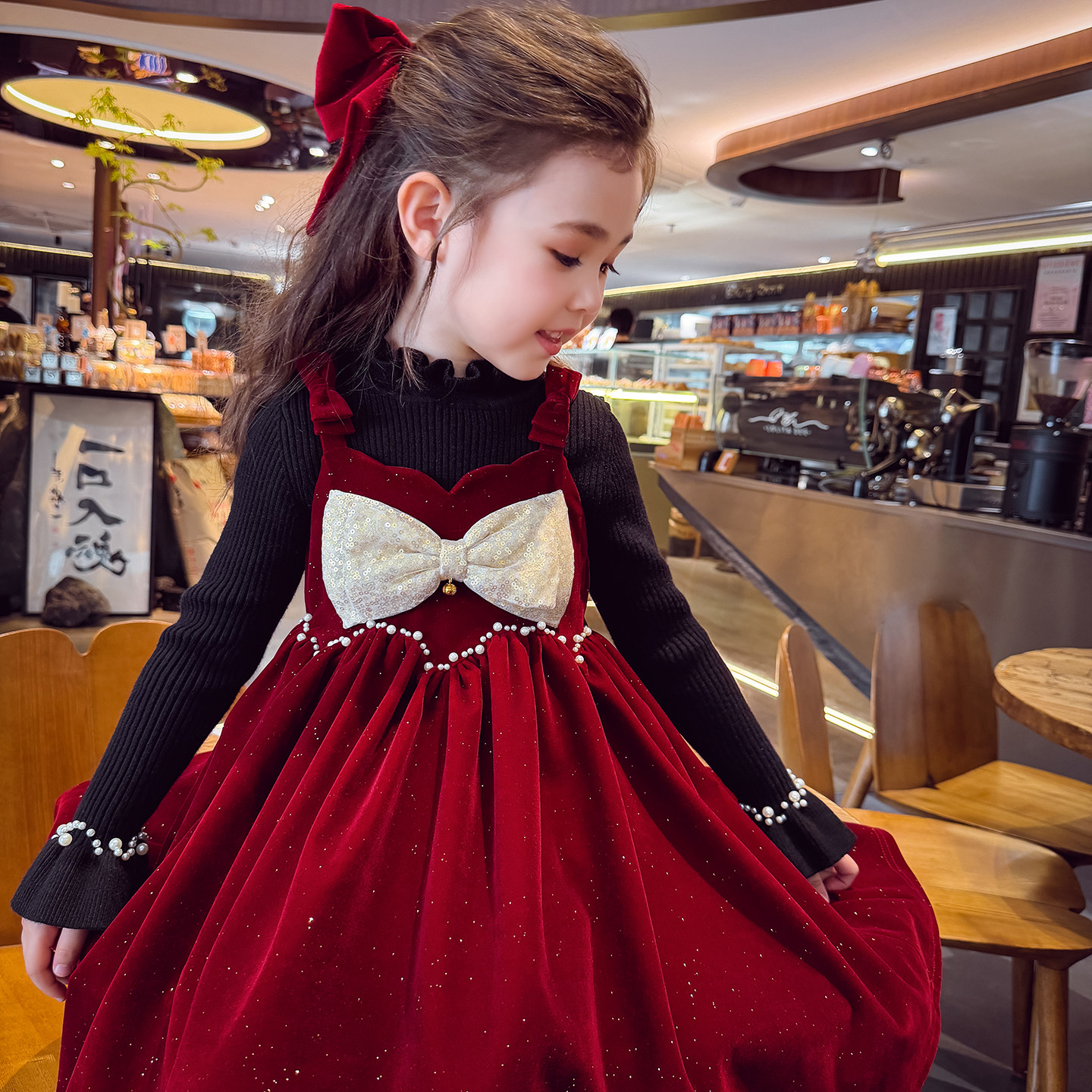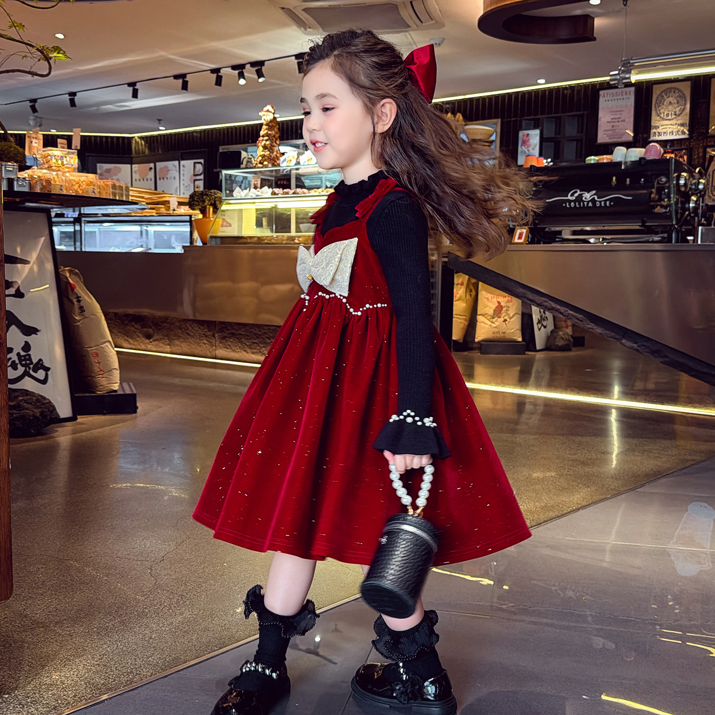 女童丝绒裙冬装2025新款儿童韩版烫金蝴蝶结礼服公主裙女孩连衣裙