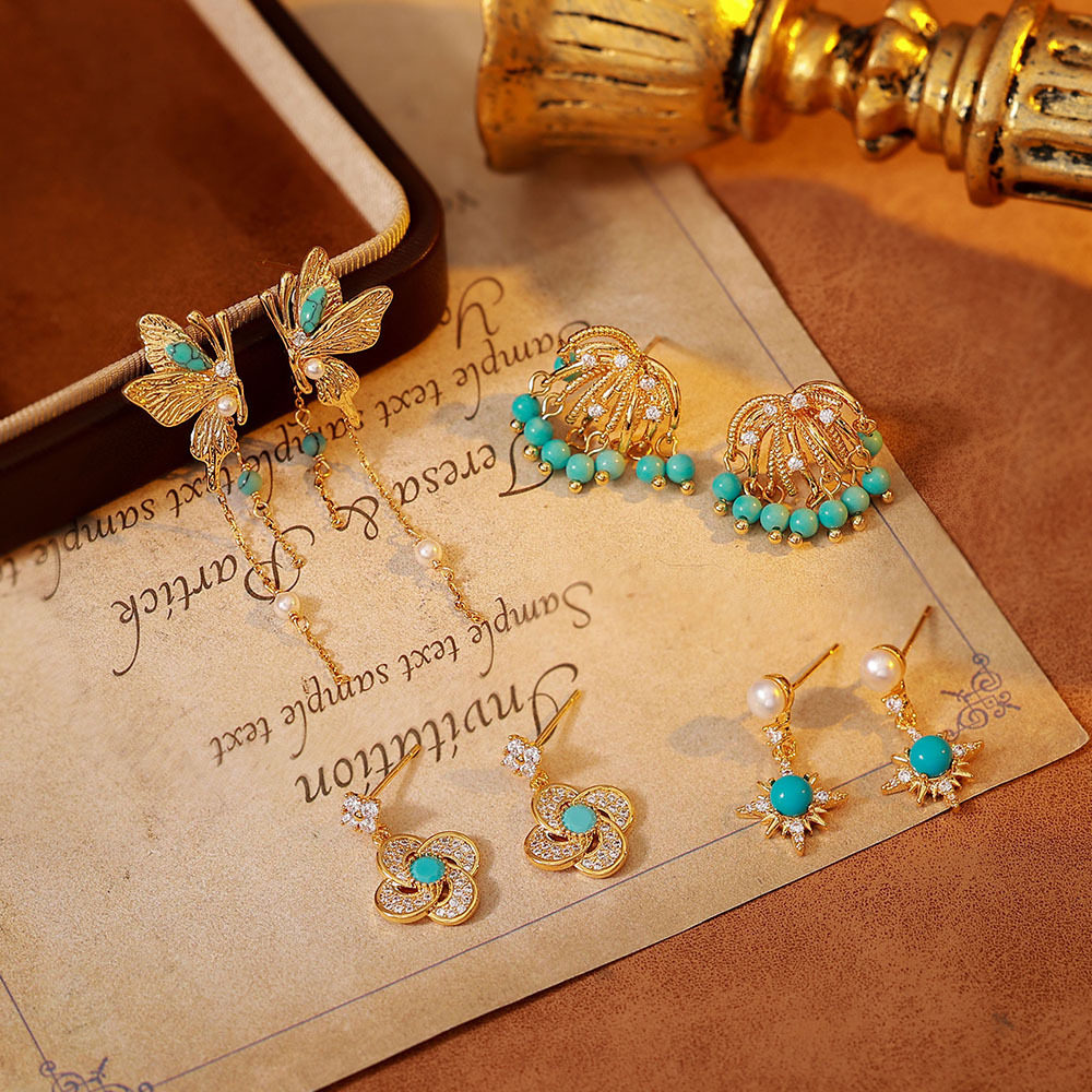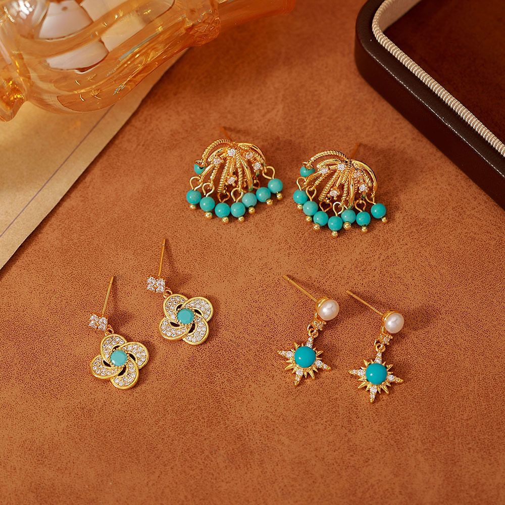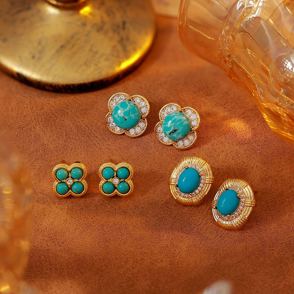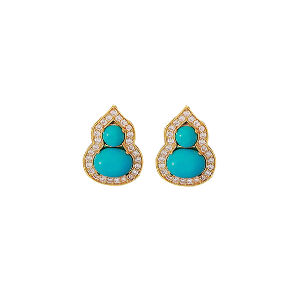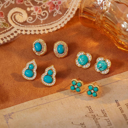 新中式微镶绿松石耳钉S925银针高级感复古精致轻奢气质耳环耳饰品