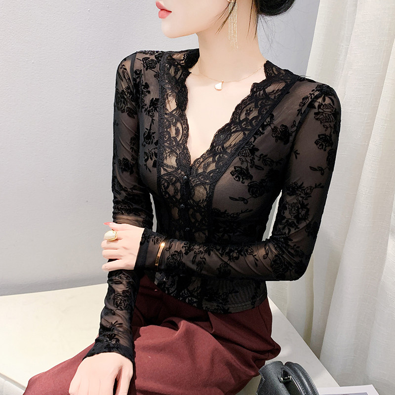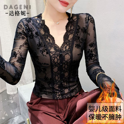 常规/加绒V领蕾丝打底衫女内搭秋冬款设计感加绒加厚长袖上衣