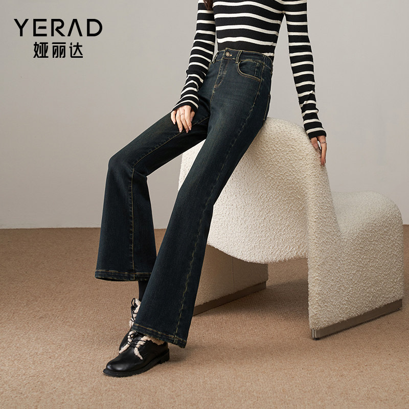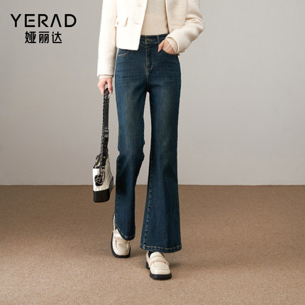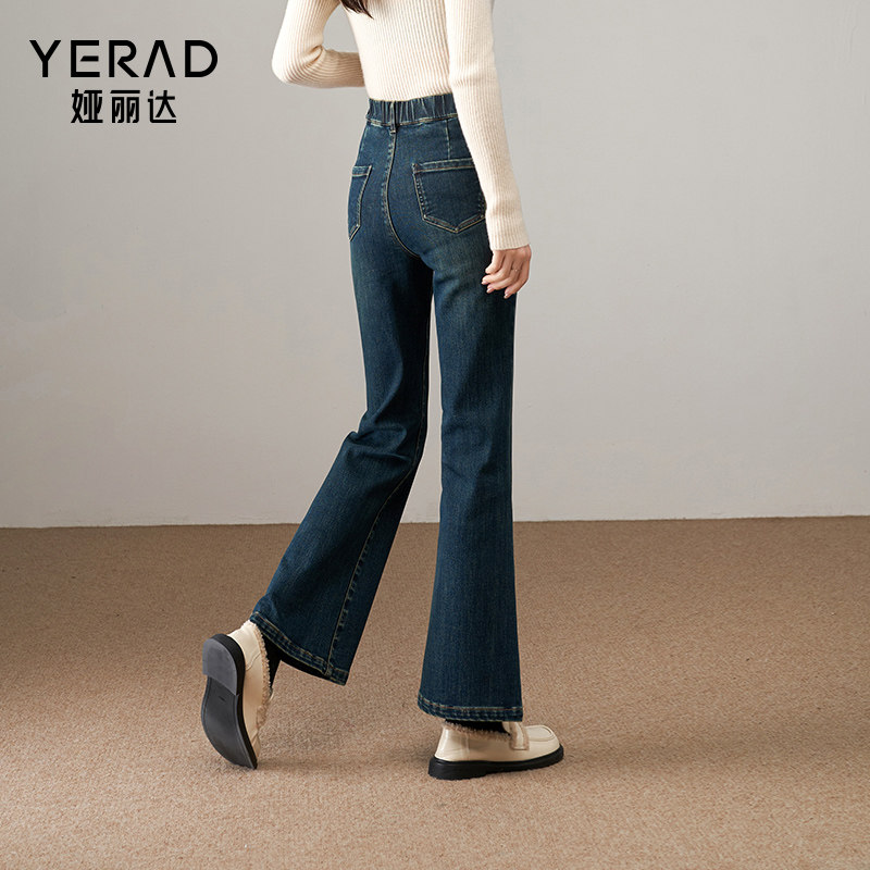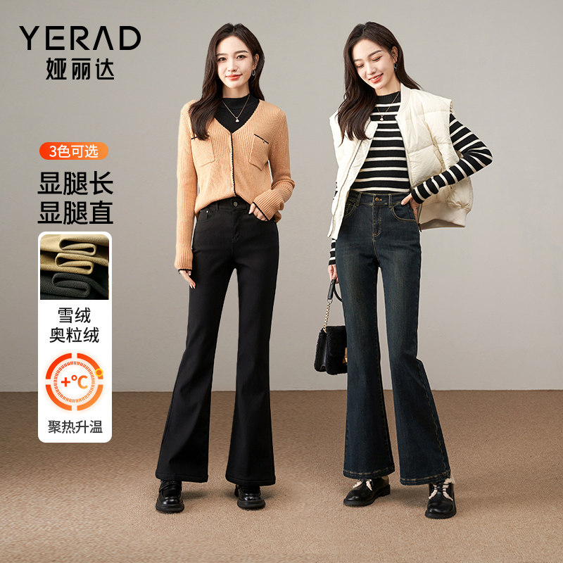 娅丽达加绒微喇牛仔裤女2025冬季新款大码女裤弹力修身黑色喇叭裤