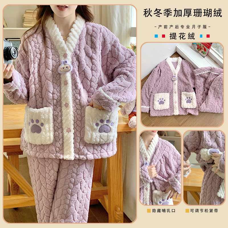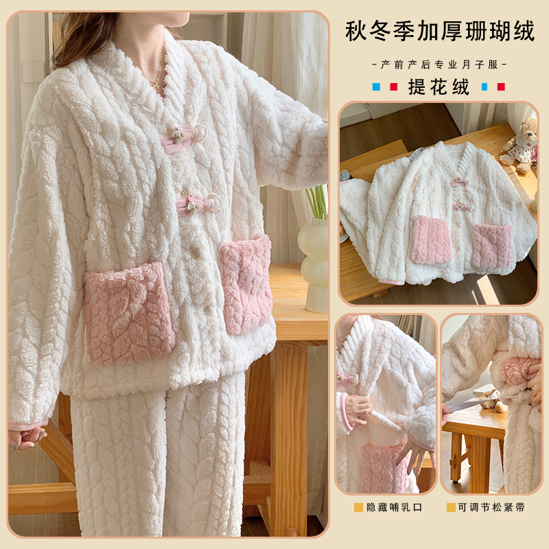 秋冬季加厚保暖产后喂奶哺乳珊瑚绒月子服待产孕妇睡衣法兰绒怀孕