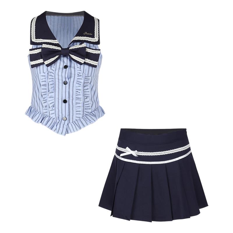 甜美学院风套装女海军领无袖背心上衣夏季a字百褶半身短裙两件套