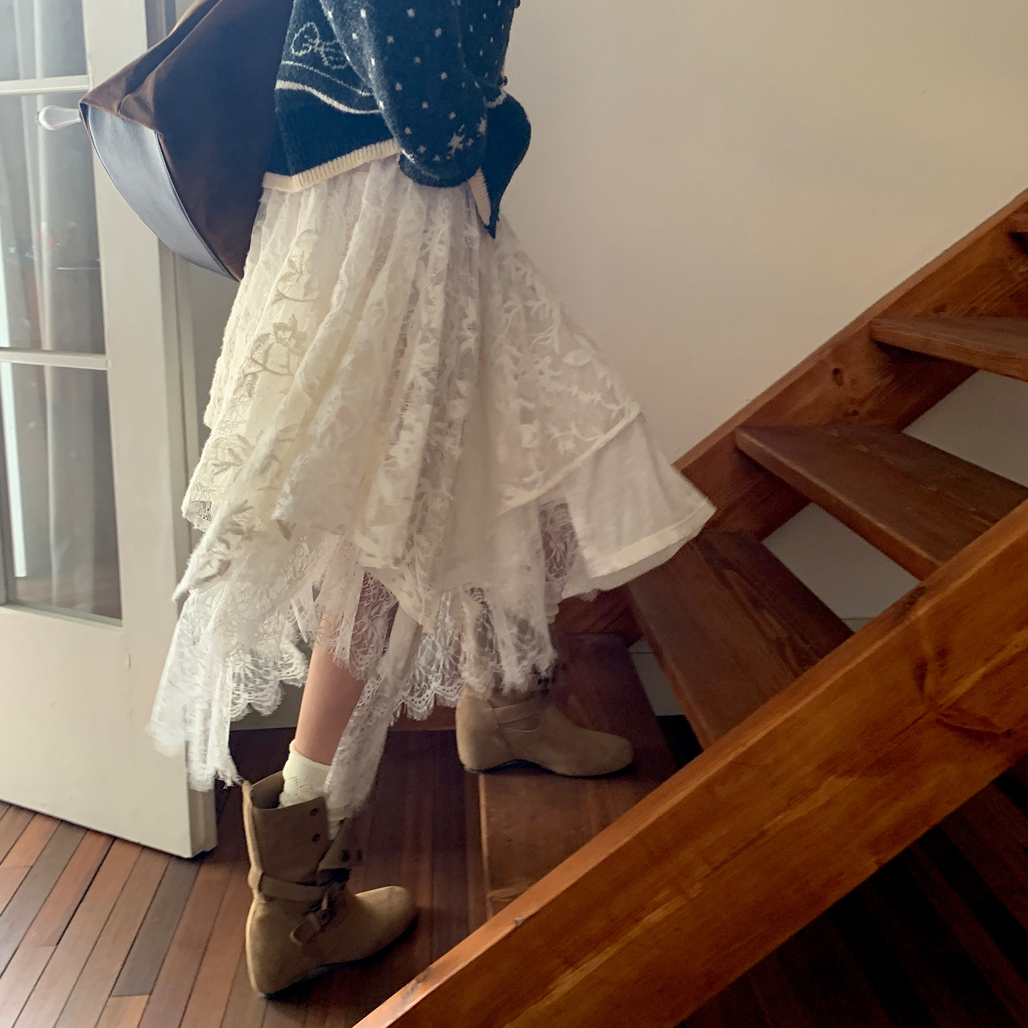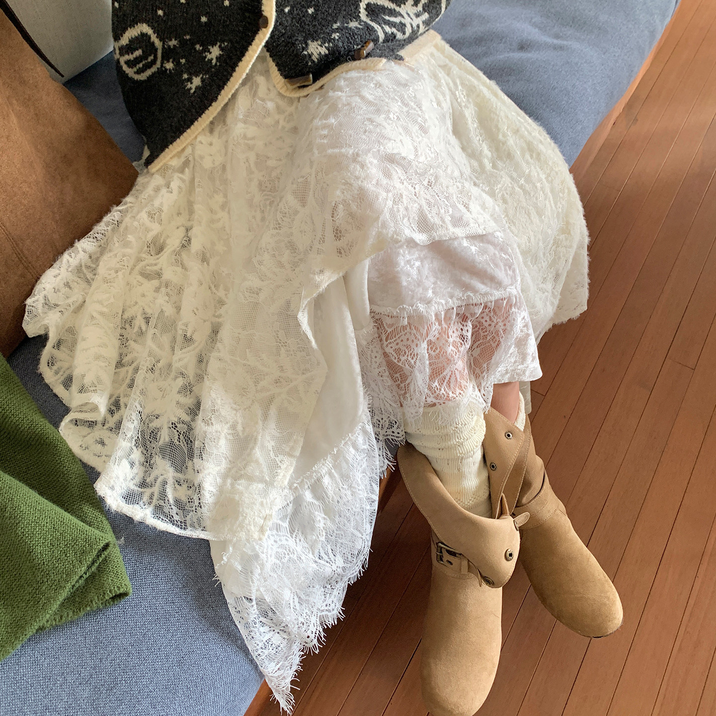 尺尺间Lsland韩系复古不规则蕾丝半身裙女春秋新款设计感a字长裙