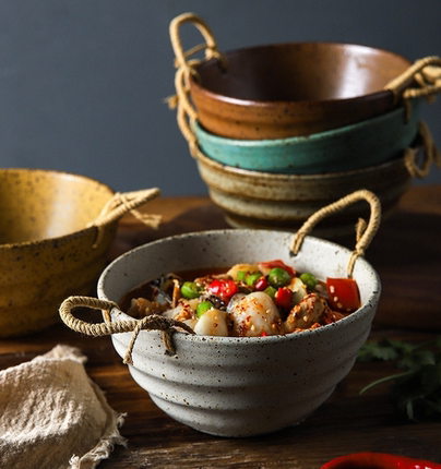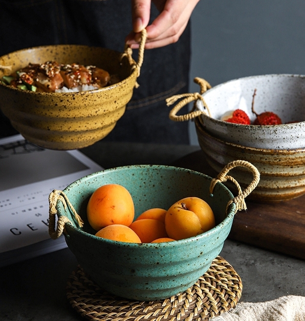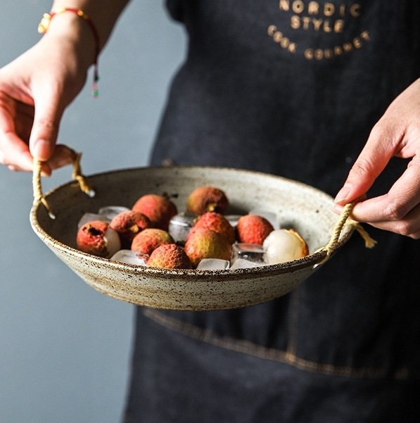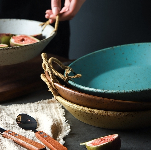 复古粗陶双耳盘日式深盘水果盘菜盘家用简约面碗