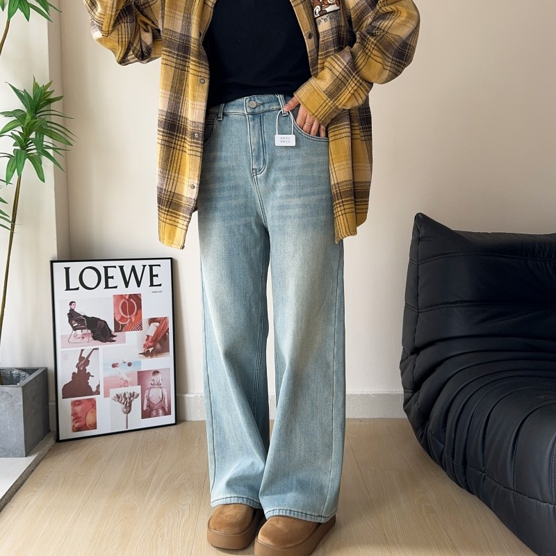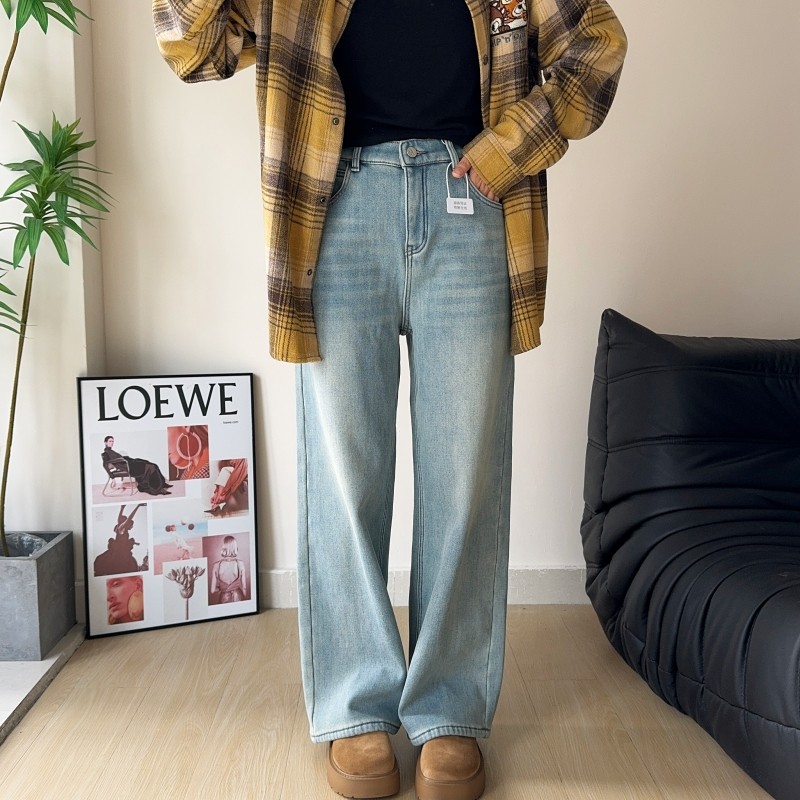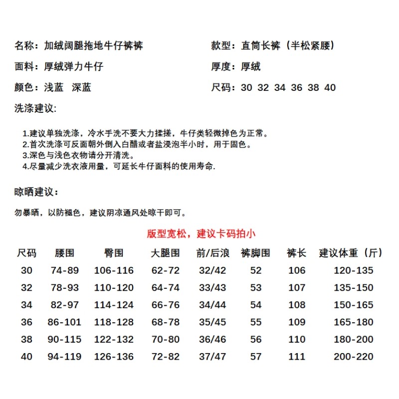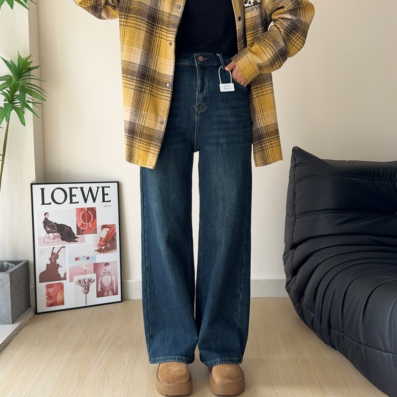 大码厚绒阔腿拖地牛仔裤深蓝浅蓝