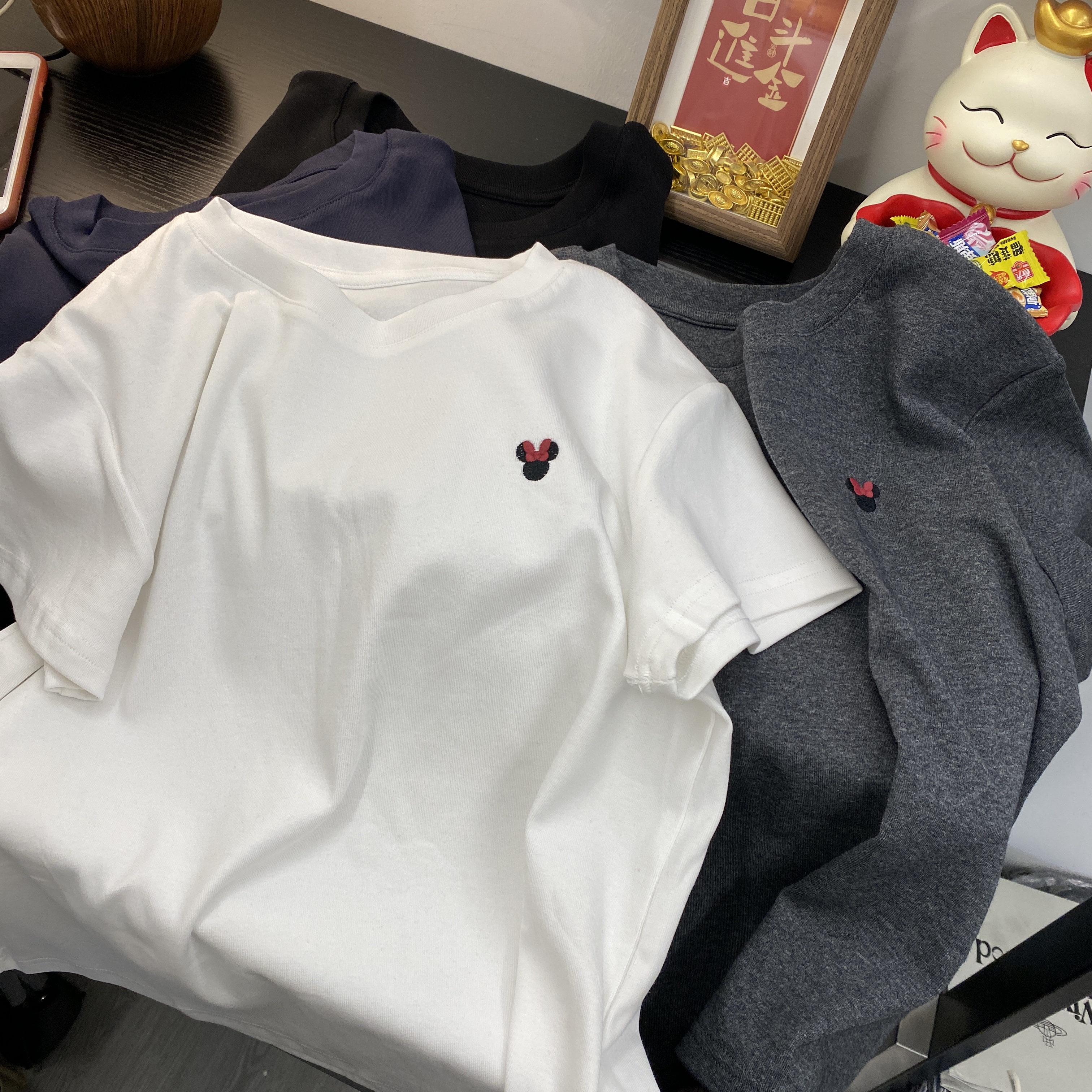 2025秋新款韩版时尚圆领简约百搭刺绣米奇短袖T恤女正肩显瘦内搭