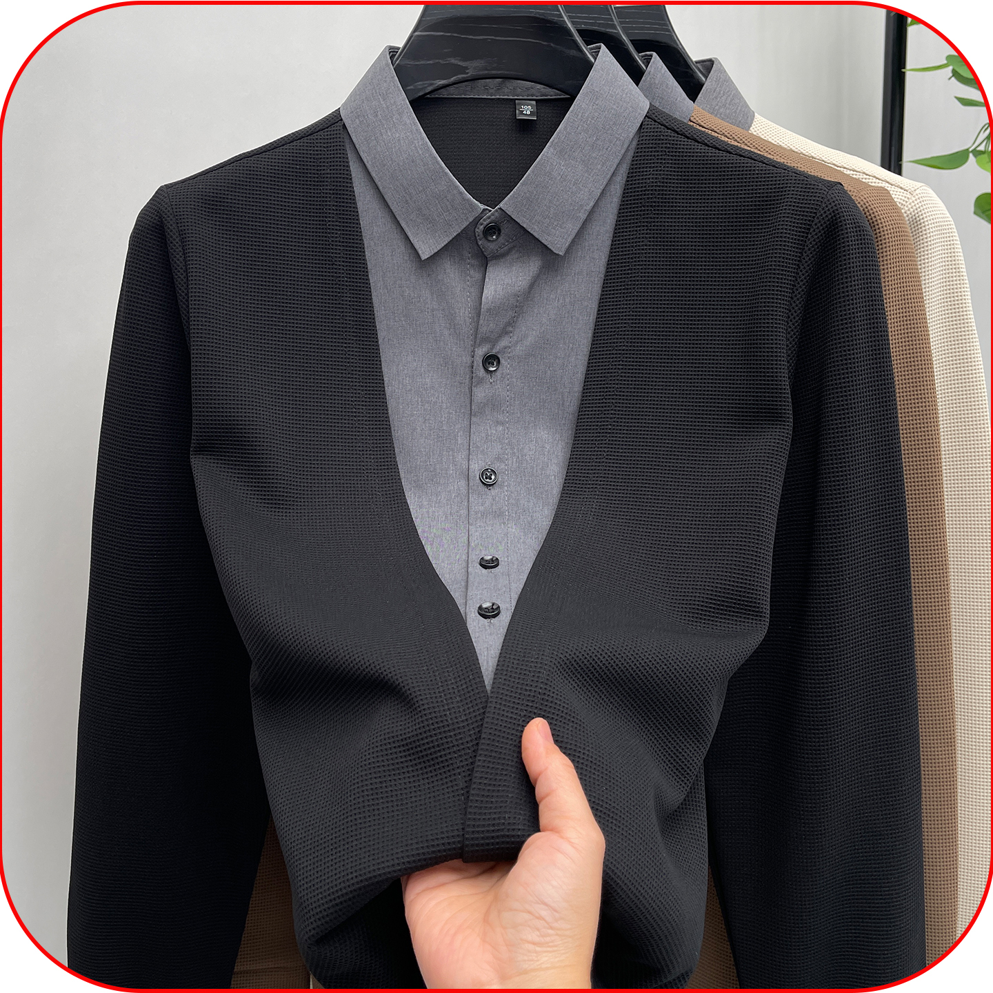 假两件长袖t恤男士高端春秋新款休闲商务拼接衬衫领开衫男装外套