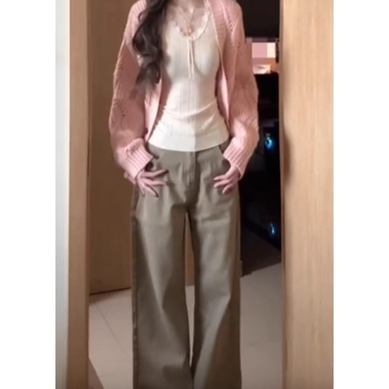 韩系秋穿搭粉色V领麻花毛衣开衫