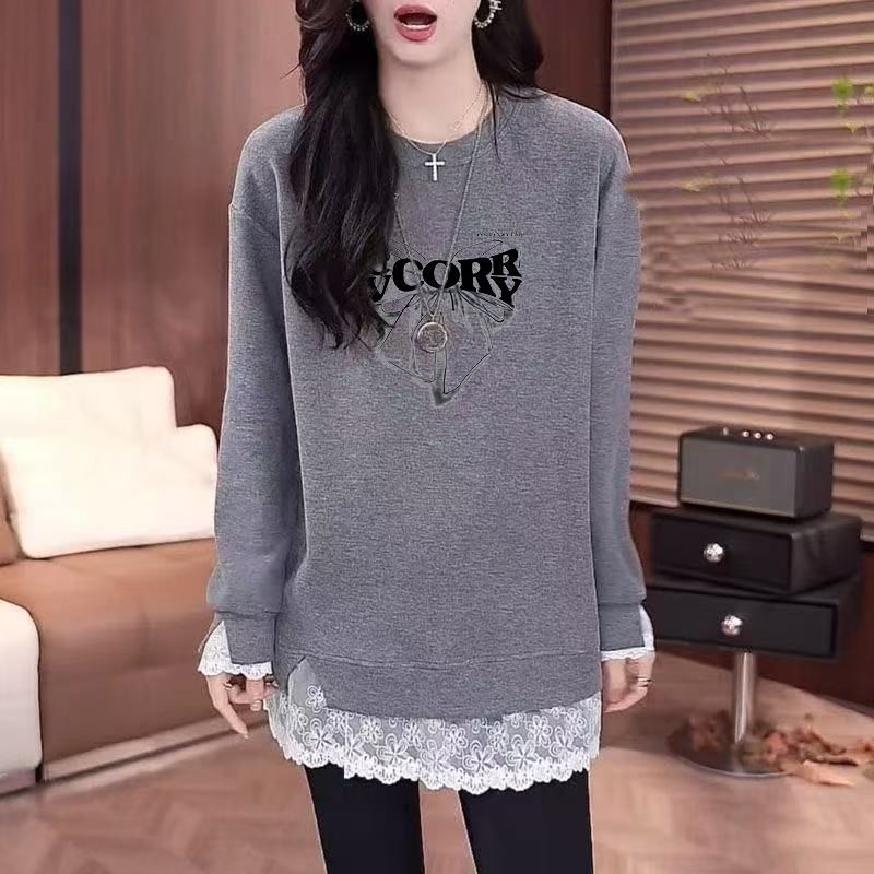 拼接蕾丝设计新款打底春秋卫衣女德绒圆领宽松中长款遮肉上衣外穿