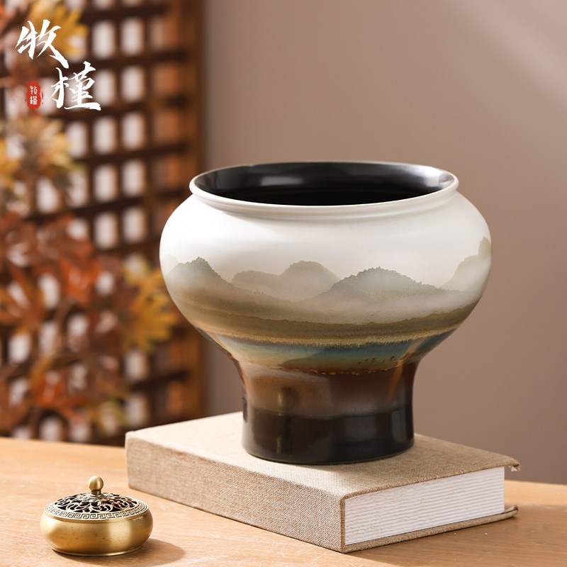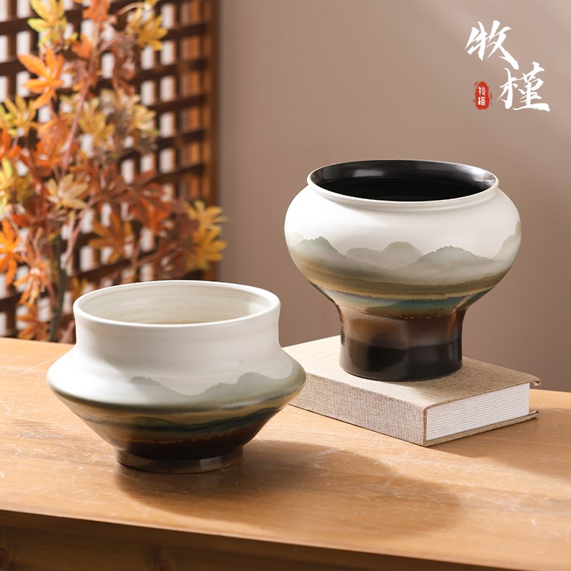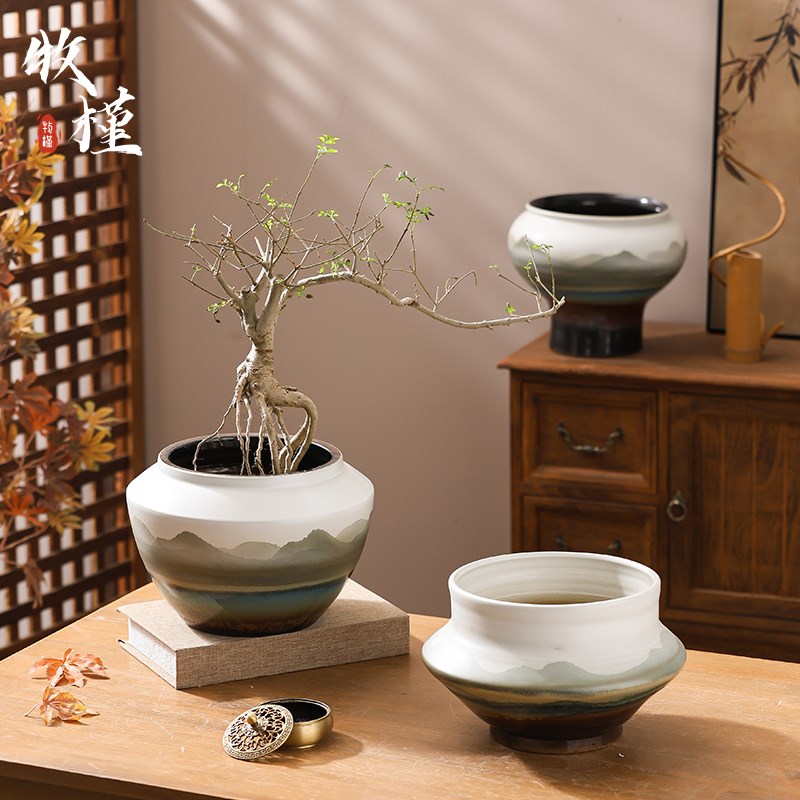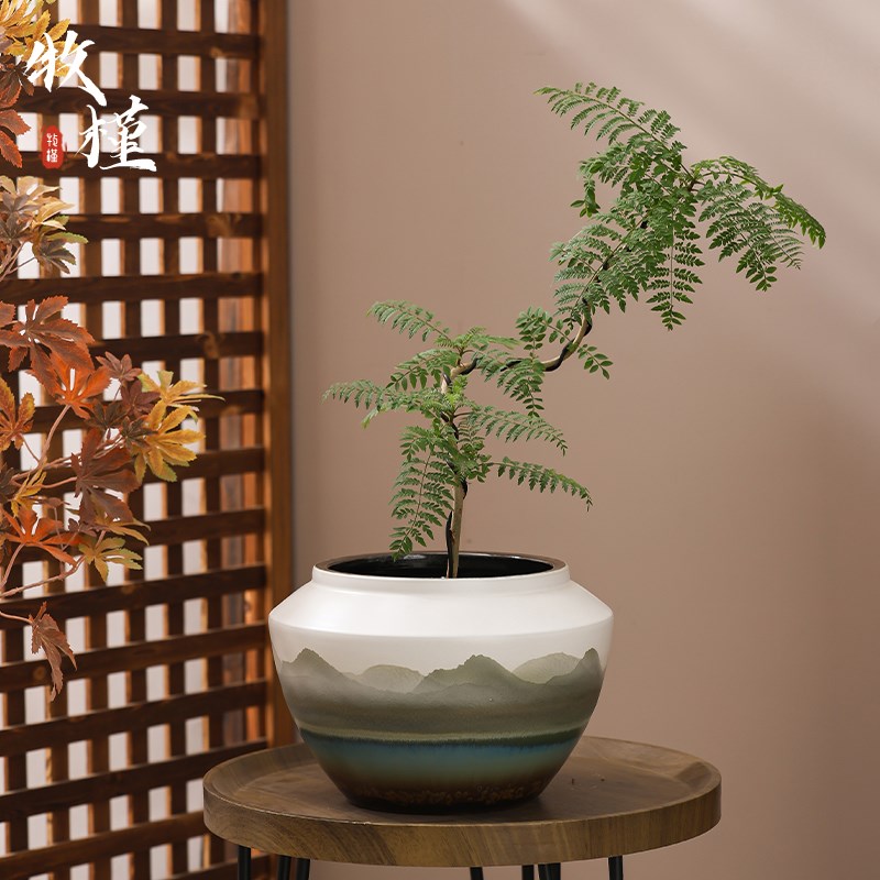新中式景德镇陶瓷花盆客厅复古山水花瓶白色高级龟背竹盆大号