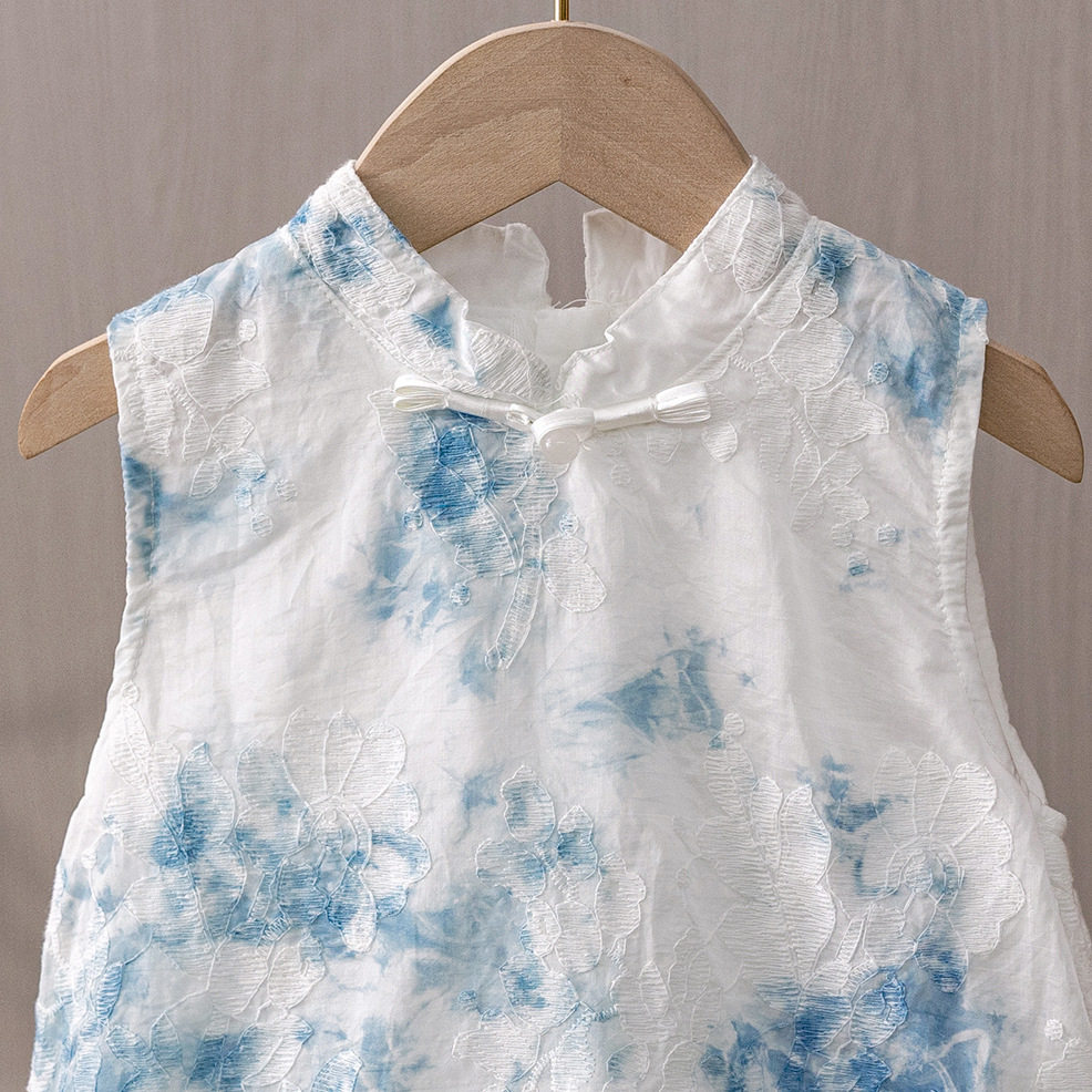 云南古法扎染女童无袖旗袍连衣裙夏季新款重工刺绣洋气蓝染背心裙