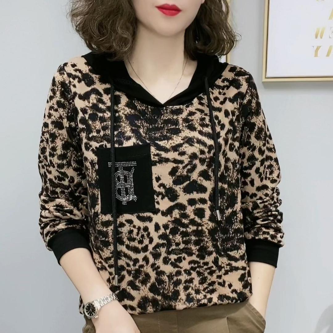 秋季妈妈装洋气豹纹打底衫女装气质长袖上衣女t恤衫连帽卫衣