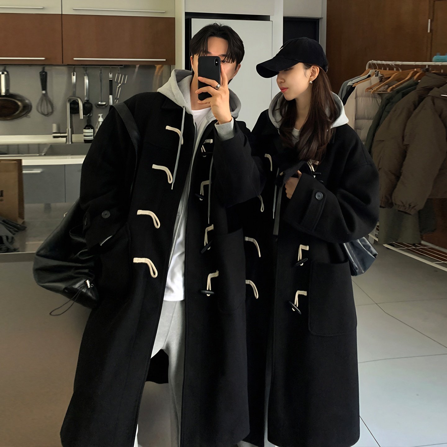 牛角扣大衣男士中长款秋冬季加厚呢子防寒风衣韩版情侣毛呢外套女