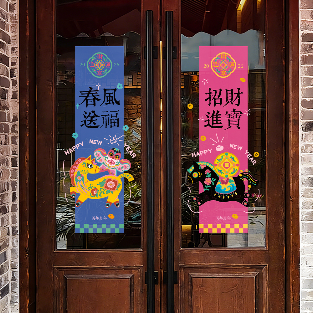 中式新年装饰墙贴商场店铺橱窗文创条幅玻璃贴纸2026马年卡通窗花